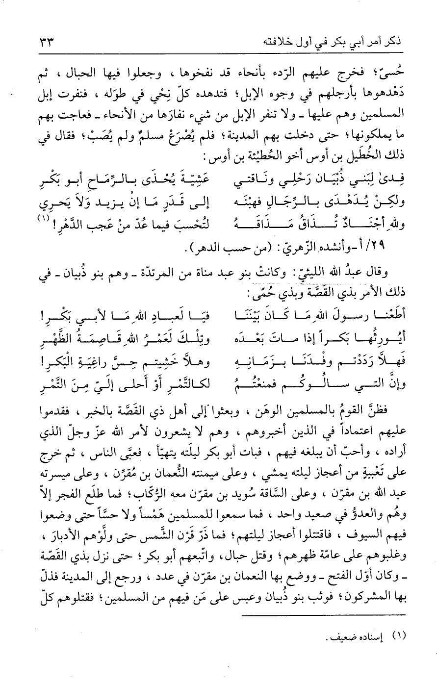 فظنَّ القومُ بالمسلمين الوهَن، وبعثوا إلى أهل ذي القَصَّة بالخبر، فقدموا عليهم اعتمادًا في الذين أخبروهم، وهم لا يشعرون لأمر الله عزّ وجلّ الذي أراده، وأحبّ أن يبلغه فيهم، فبات أبو بكر ليلَته يتهيّأ، فعبَّى الناس، ثم خرج على تَعْبيةٍ من أعجاز ليلته يمشي، وعلى ميمنته النُّعمان بن مُقرِّن، وعلى ميسرته عبد الله بن مقرّن، وعلى السَّاقة سُويد بن مقرّن معه الرُّكّاب؛ فما طلَع الفجر إلّا وهُم والعدوُّ في صعيد واحد، فما سمعوا للمسلمين هَمْسًا ولا حسًّا حتى وضعوا فيهم السيوف، فاقتتلوا أعجاز ليلتهم؛ فما ذَرّ قَرْن الشَّمس حتى ولَّوْهم الأدبارَ، وغلبوهم على عامّة ظهرهم؛ وقتل حبال، واتّبعهم أبو بكر؛ حتى نزل بذي القَصّة -وكان أوّل الفتح- ووضع بها النعمان بن مقرّن في عدد، ورجع إلى المدينة فذلّ بها المشركون؛ فوثب بنو ذُبيان وعبس على مَن فيهم من المسلمين؛ فقتلوهم كلّ