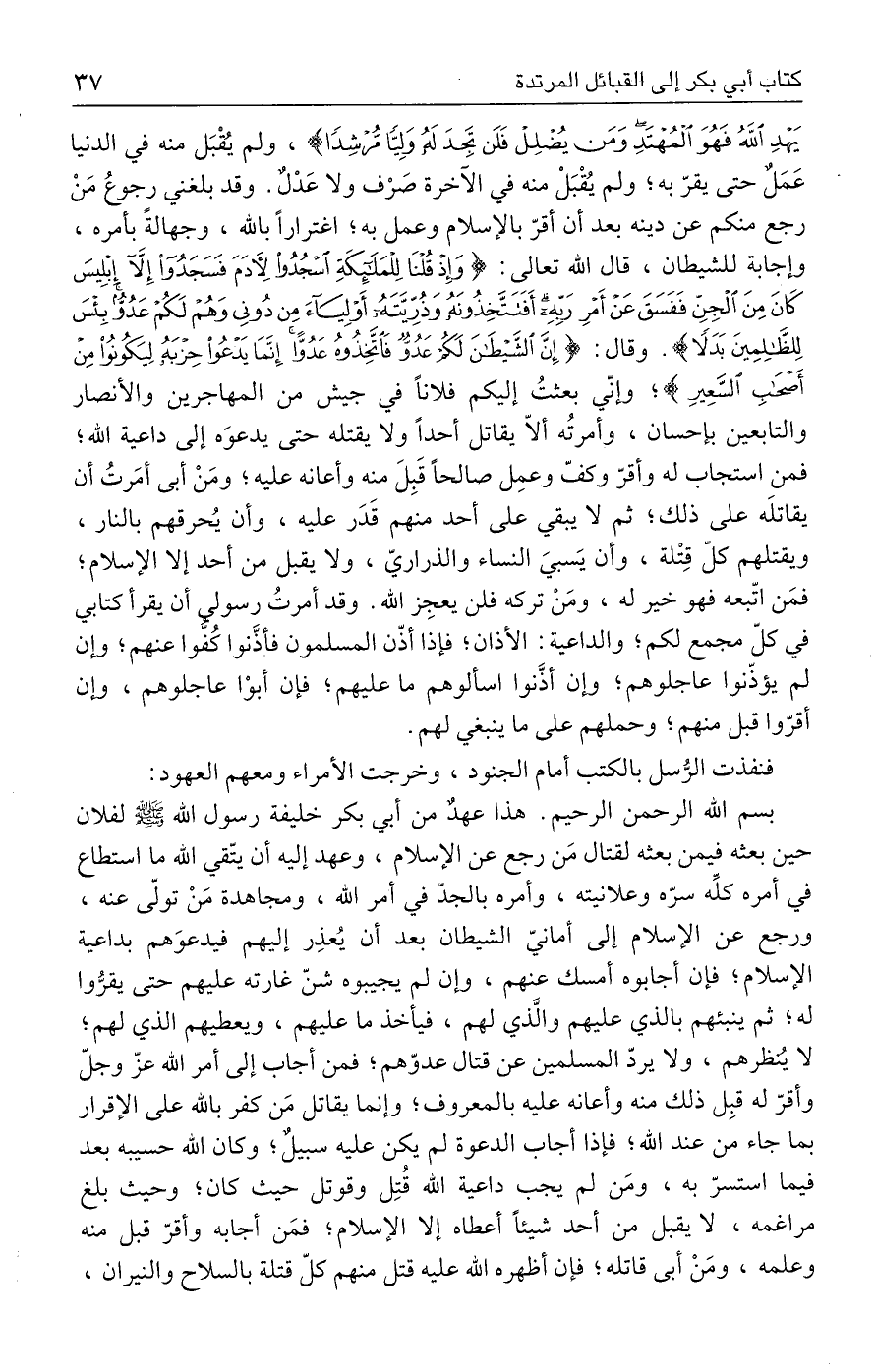يَهْدِ اللَّهُ فَهُوَ الْمُهْتَدِ وَمَنْ يُضْلِلْ فَلَنْ تَجِدَ لَهُ وَلِيًّا مُرْشِدًا (١٧)}، ولم يُقْبَل منه في الدنيا عَمَلٌ حتى يقرّ به؛ ولم يُقْبَلْ منه في الآخرة صَرْف ولا عَدْلٌ. وقد بلغني رجوعُ مَنْ رجع منكم عن دينه بعد أن أقرّ بالإسلام وعمل به؛ اغترارًا بالله، وجهالةً بأمره، وإجابة للشيطان، قال الله تعالى: {وَإِذْ قُلْنَا لِلْمَلَائِكَةِ اسْجُدُوا لِآدَمَ فَسَجَدُوا إلا إِبْلِيسَ كَانَ مِنَ الْجِنِّ فَفَسَقَ عَنْ أَمْرِ رَبِّهِ أَفَتَتَّخِذُونَهُ وَذُرِّيَّتَهُ أَوْلِيَاءَ مِنْ دُونِي وَهُمْ لَكُمْ عَدُوٌّ بِئْسَ لِلظَّالِمِينَ بَدَلًا (٥٠)}. وقال: {إِنَّ الشَّيطَانَ لَكُمْ عَدُوٌّ فَاتَّخِذُوهُ عَدُوًّا إِنَّمَا يَدْعُو حِزْبَهُ لِيَكُونُوا مِنْ أَصْحَابِ السَّعِيرِ (٦)}؛ وإنّي بعثتُ إليكم فلانًا في جيش من المهاجرين والأنصار والتابعين بإحسان، وأمرتُه ألّا يقاتل أحدًا ولا يقتله حتى يدعوَه إلى داعية الله؛ فمن استجاب له وأقرّ وكفّ وعمِل صالحًا قَبِلَ منه وأعانه عليه؛ ومَنْ أبي أمَرتُ أن يقاتلَه على ذلك؛ ثم لا يبقي على أحد منهم قَدَر عليه، وأن يُحرقهم بالنار، ويقتلهم كلّ قِتْلة، وأن يَسبيَ النساء والذراريّ، ولا يقبل من أحد إلا الإسلام؛ فمَن اتّبعه فهو خير له، ومَنْ تركه فلن يعجِز الله. وقد أمرتُ رسولي أن يقرأ كتابي في كلّ مجمع لكم؛ والداعية: الأذان؛ فإذا أذّن المسلمون فأذَّنوا كُفّوا عنهم؛ وإن لم يؤذّنوا عاجلوهم؛ وإن أذَّنوا اسألوهم ما عليهم؛ فإن أبوْا عاجلوهم، وإن أقرّوا قبل منهم؛ وحملهم على ما ينبغي لهم.