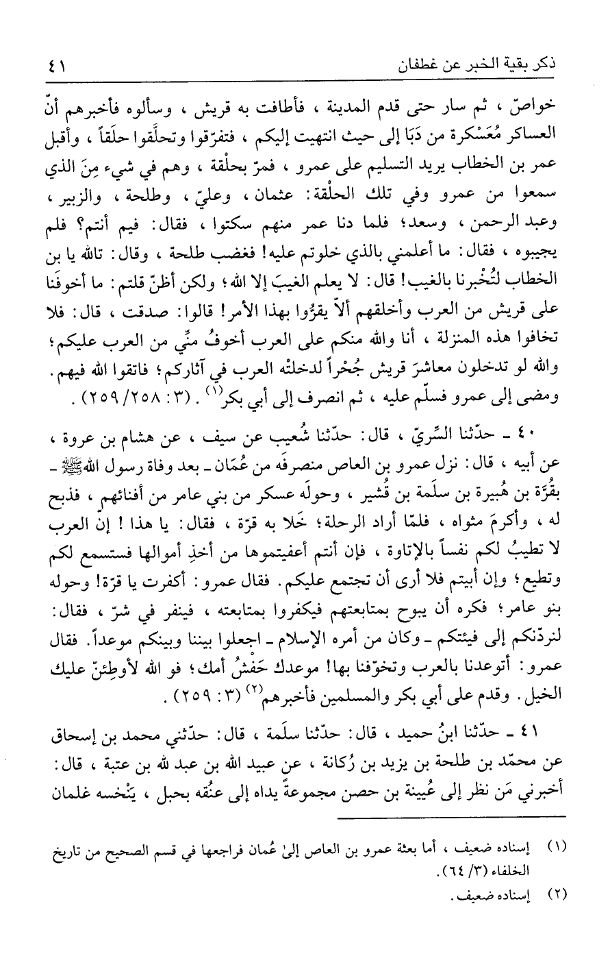 ٤١ - حدَّثنا ابنُ حميد، قال: حدَّثنا سلَمة، قال: حدّثني محمد بن إسحاق عن محمّد بن طلحة بن يزيد بن رُكانة، عن عبيد الله بن عبد لله بن عتبة، قال: أخبرني مَن نظر إلى عُيينة بن حصن مجموعة يداه إلى عنُقه بحبل، يَنْخسه غلمان