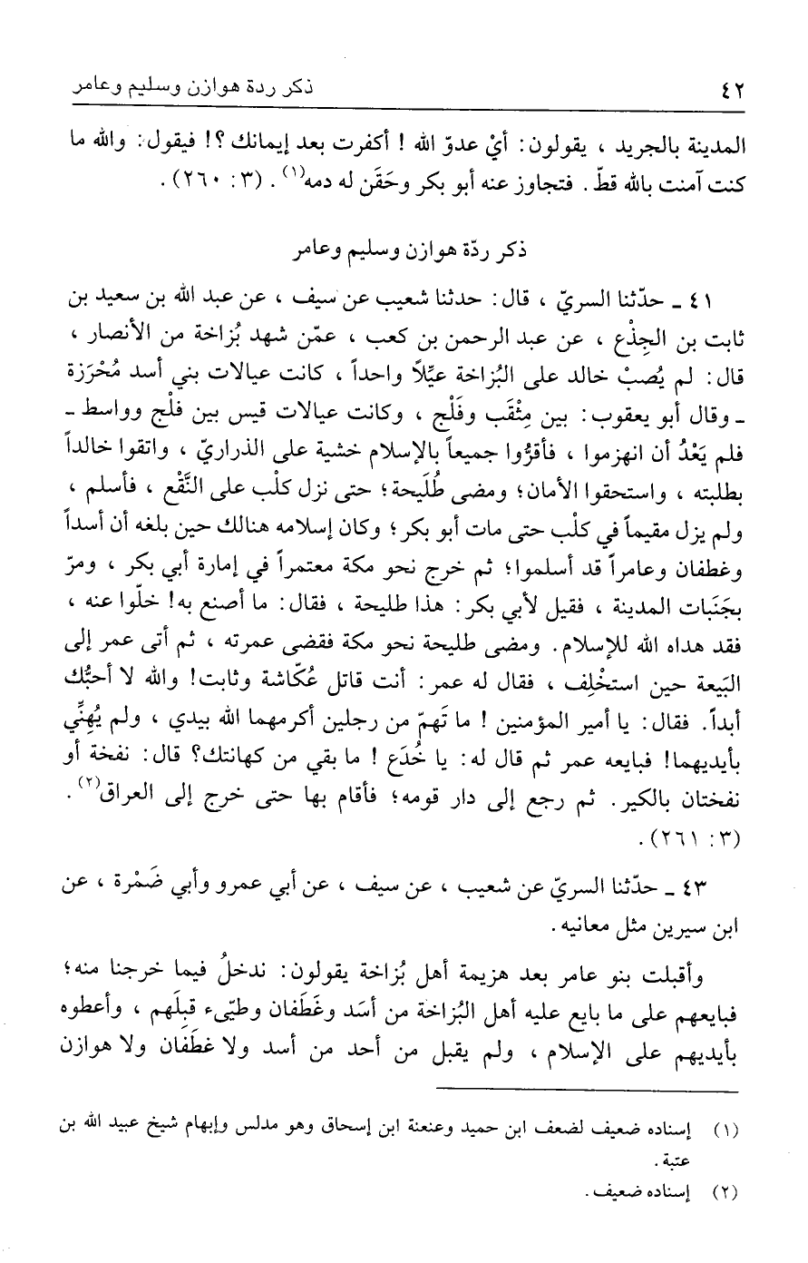 ٤١ - حدثنا السريّ، قال: حدثنا شعيب عن سيف، عن عبد الله بن سعيد بن ثابت بن الجِذْع، عن عبد الرحمن بن كعب، عمّن شهد بُزاخة من الأنصار، قال: لم يُصبْ خالد على البُزاخة عيِّلًا واحدًا، كانت عيالات بني أسد مُحْرَزة -وقال أبو يعقوب: بين مِثْقَب وفَلْج، وكانت عيالات قيس بين فلْج وواسط- فلم يَعْدُ أن انهزموا، فأقرُّوا جميعًا بالإسلام خشية على الذراريّ، واتقوا خالدًا بطلبته، واستحقوا الأمان؛ ومضى طُلَيحة؛ حتى نزل كلْب على النَّقْع، فأسلم، ولم يزل مقيمًا في كلْب حتى مات أبو بكر؛ وكان إسلامه هنالك حين بلغه أن أسدًا وغطفان وعامرًا قد أسلموا؛ ثم خرج نحو مكة معتمرًا في إمارة أبي بكر، ومرّ بجَنَبات المدينة، فقيل لأبي بكر: هذا طليحة، فقال: ما أصنع به! خلّوا عنه، فقد هداه الله للإسلام. ومضى طليحة نحو مكة فقضى عمرته، ثم أتى عمر إلى البَيعة حين استخْلِف، فقال له عمر: أنت قاتل عُكّاشة وثابت! والله لا أحبُّك أبدًا. فقال: يا أمير المؤمنين! ما تَهمّ من رجلين أكرمهما الله بيدي، ولم يُهِنِّي بأيديهما! فبايعه عمر ثم قال له: يا خُدَع! ما بقي من كهانتك؟ قال: نفخة أو نفختان بالكير. ثم رجع إلى دار قومه؛ فأقام بها حتى خرج إلى العراق (٢). (٣: ٢٦١).