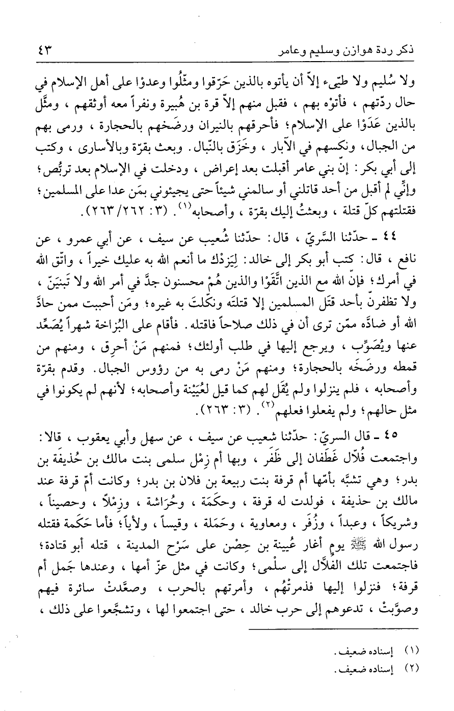 ٤٤ - حدَّثنا السَّريّ، قال: حدَّثنا شُعيب عن سيف، عن أبي عمرو، عن نافع، قال: كتب أبو بكر إلى خالد: لِيَزدْك ما أنعم الله به عليك خيرًا، واتّق الله في أمرك؛ فإنّ الله مع الذين اتَّقَوْا والذين هُمْ محسنون جدَّ في أمر الله ولا تَبنيَن، ولا تظفرنّ بأحد قتَل المسلمين إلا قتلتَه ونكّلتَ به غيره؛ ومَن أحببت ممن حادَّ الله أو ضادَّه ممّن ترى أن في ذلك صلاحًا فاقتله. فأقام على البُزاخة شهرًا يُصَعِّد عنها ويُصَوِّب، ويرجع إليها في طلب أولئك؛ فمنهم مَنْ أحرِق، ومنهم من قمطه ورضَخَه بالحجارة؛ ومنهم مَنْ رمى به من رؤوس الجبال. وقدم بقرّة وأصحابه، فلم ينزلوا ولم يُقَل لهم كما قيل لعُيَينة وأصحابه؛ لأنهم لم يكونوا في مثل حالهم؛ ولم يفعلوا فعلهم (٢). (٣: ٢٦٣).