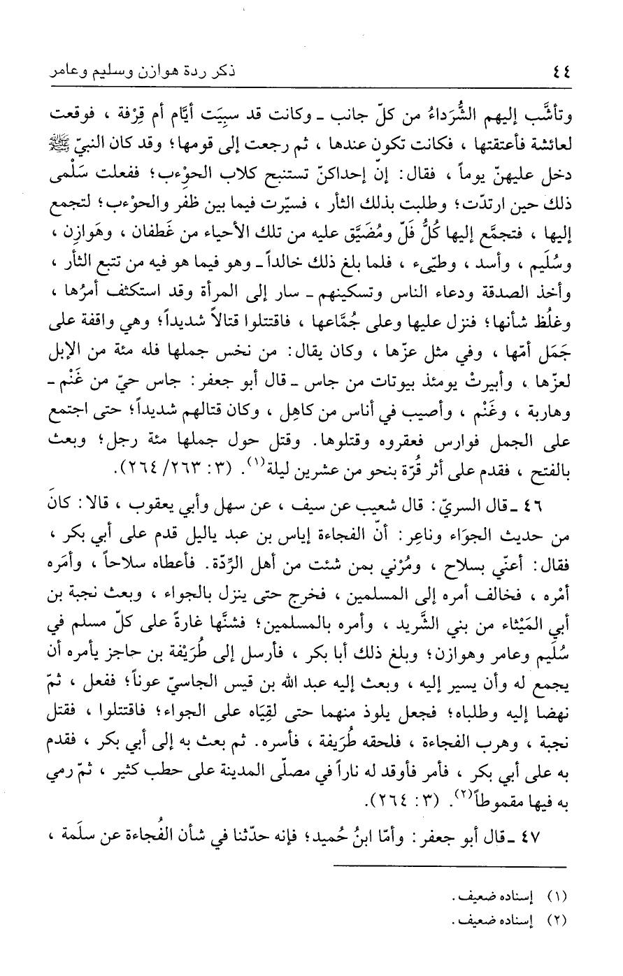٤٦ - قال السريّ: قال شعيب عن سيف، عن سهل وأبي يعقوب، قالا: كانَ من حديث الجوَاء وناعِر: أنّ الفجاءة إياس بن عبد ياليل قدم على أبي بكر، فقال: أعنّي بسلاح، ومُرْني بمن شئت من أهل الرِّدّة. فأعطاه سلاحًا، وأمَره أمْره، فخالف أمره إلى المسلمين، فخرج حتى ينزل بالجواء، وبعث نجبة بن أبي المَيثاء من بني الشَّريد، وأمره بالمسلمين؛ فشنَّها غارةً على كلّ مسلم في سُلَيم وعامر وهوازن؛ وبلغ ذلك أبا بكر، فأرسل إلى طُرَيفة بن حاجز يأمره أن يجمع له وأن يسير إليه، وبعث إليه عبد الله بن قيس الجاسيّ عونًا؛ ففعل، ثمّ نهضا إليه وطلباه؛ فجعل يلوذ منهما حتى لقِيَاه على الجواء؛ فاقتتلوا، فقتل نجبة، وهرب الفجاءة، فلحقه طُرَيفة، فأسره. ثم بعث به إلى أبي بكر، فقدم به على أبي بكر، فأمر فأوقد له نارًا في مصلّى المدينة على حطب كثير، ثمّ رمي به فيها مقموطًا (٢). (٣: ٢٦٤).
