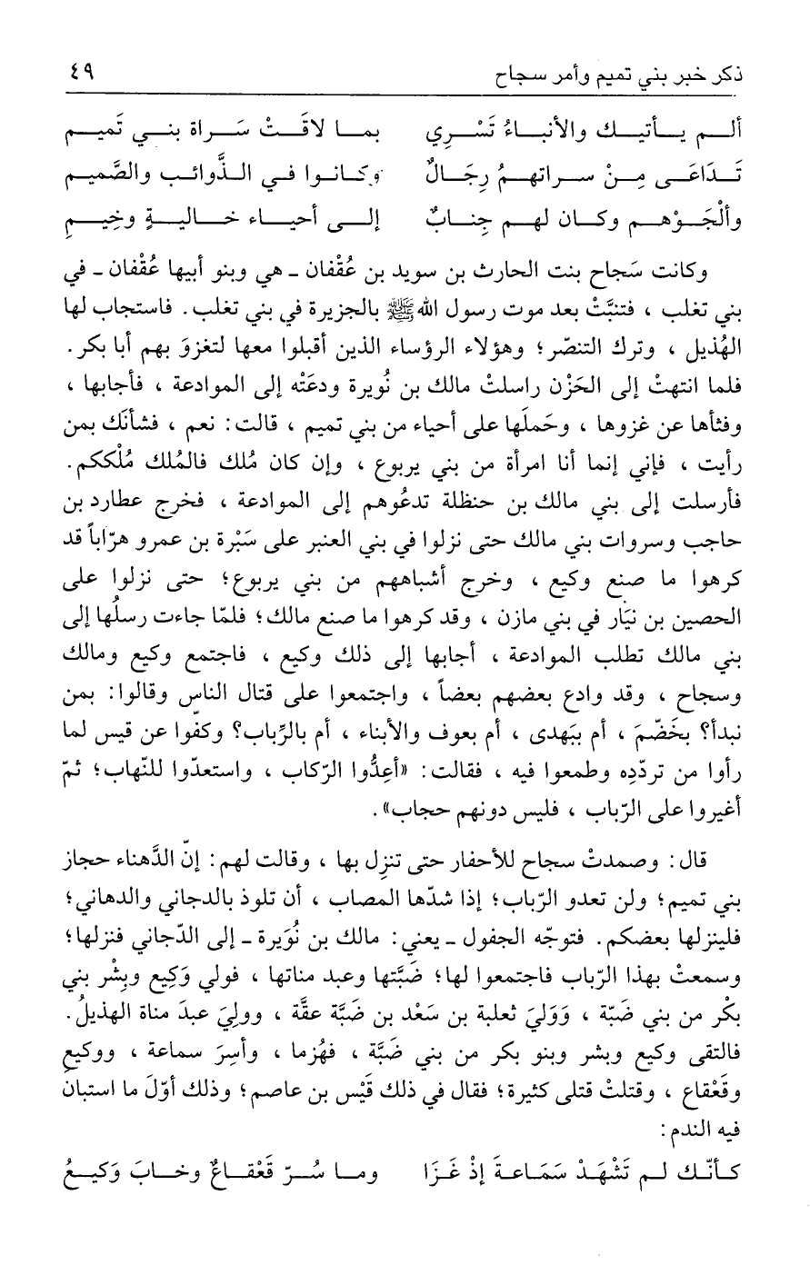 وكانت سَجاح بنت الحارث بن سويد بن عُقْفان -هي وبنو أبيها عُقْفان- في بني تغلب، فتنبَّتْ بعد موت رسول الله - صلى الله عليه وسلم - بالجزيرة في بني تغلب. فاستجاب لها الهُذيل، وترك التنصّر؛ وهؤلاء الرؤساء الذين أقبلوا معها لتغزوَ بهم أبا بكر. فلما انتهتْ إلى الحَزْن راسلتْ مالك بن نُويرة ودعَتْه إلى الموادعة، فأجابها، وفثأها عن غزوها، وحَملَها على أحياء من بني تميم، قالت: نعم، فشأنَك بمن رأيت، فإني إنما أنا امرأة من بني يربوع، وإن كان مُلك فالمُلك مُلْككم. فأرسلت إلى بني مالك بن حنظلة تدعُوهم إلى الموادعة، فخرج عطارد بن حاجب وسروات بني مالك حتى نزلوا في بني العنبر على سَبْرة بن عمرو هرّابًا قد كرهوا ما صنع وكيع، وخرج أشباههم من بني يربوع؛ حتى نزلوا على الحصين بن نيَار في بني مازن، وقد كرهوا ما صنع مالك؛ فلمّا جاءت رسلُها إلى بني مالك تطلب الموادعة، أجابها إلى ذلك وكيع، فاجتمع وكيع ومالك وسجاح، وقد وادع بعضهم بعضًا، واجتمعوا على قتال الناس وقالوا: بمن نبدأ؟ بخَضمَ، أم ببَهدى، أم بعوف والأبناء، أم بالرِّباب؟ وكفّوا عن قيس لما رأوا من تردّدِه وطمعوا فيه، فقالت: "أعِدُّوا الرّكاب، واستعدّوا للنّهاب؛ ثمّ أغيروا على الرّباب، فليس دونهم حجاب".
