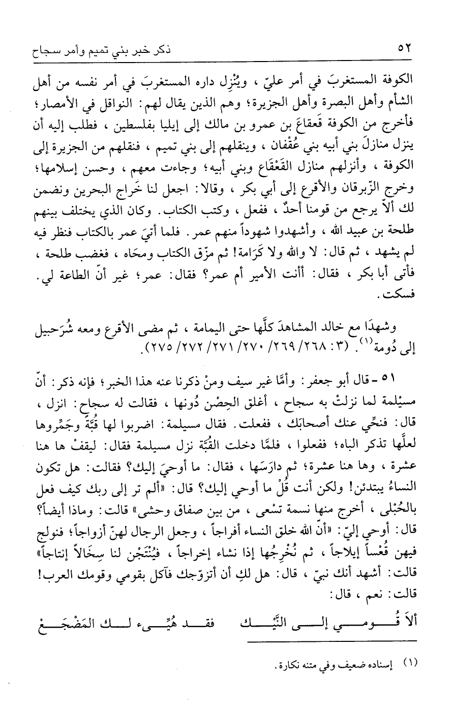 ٥١ - قال أبو جعفر: وأمَّا غير سيف ومنْ ذكرنا عنه هذا الخبر، فإنه ذكر: أنّ مسيلمة لما نزلتْ به سجاح، أغلق الحِصْن دُونها، فقالت له سجاح: انزل، قال: فنحِّي عنك أصحابَك، ففعلت. فقال مسيلمة: اضربوا لها قُبَّة وجَمِّروها لعلَّها تذكر الباء؛ ففعلوا، فلمَّا دخلت القبّة نزل مسيلمة فقال: ليقفْ ها هنا عشرة، وها هنا عشرة؛ ثم دارَسَها، فقال: ما أوحيَ إليك؟ فقالت: هل تكون النساءُ يبتدئن! ولكن أنت قُلْ ما أوحي إليك؟ قال: "ألم تر إلى ربك كيف فعل بالحُبْلى، أخرج منها نسمة تسْعى، من بين صفاق وحشى" قالت: وماذا أيضًا؟ قال: أوحي إليّ: "أنّ الله خلق النساء أفراجًا، وجعل الرجال لهنّ أزواجًا؛ فنولج فيهن قُعْسًا إيلاجًا، ثم نُخْرِجُها إذا نشاء إخراجًا، فيُنْتَجْن لنا سِخَالًا إنتاجًا" قالت: أشهد أنك نبيّ، قال: هل لكِ أن أتزوّجك فآكل بقومي وقومك العرب! قالت: نعم، قال: