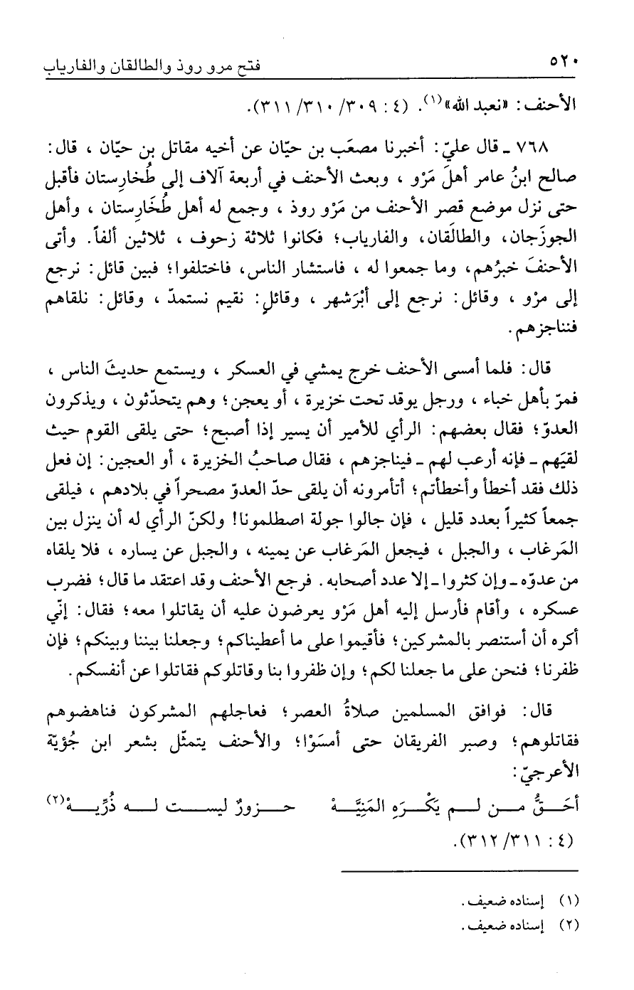 ٧٦٨ - قال عليّ: أخبرنا مصعَب بن حيّان عن أخيه مقاتل بن حيّان، قال: صالح ابنُ عامر أهلَ مَرْو، وبعث الأحنف في أربعة آلاف إلى طُخارِستان فأقبل حتى نزل موضع قصر الأحنف من مَرْو روذ، وجمع له أهل طُخَارِستان، وأهل الجوزَجان، والطالَقان، والفارياب؛ فكانوا ثلاثة زحوف، ثلاثين ألفًا. وأتى الأحنفَ خبرُهم، وما جمعوا له، فاستشار الناس، فاختلفوا؛ فبين قائل: نرجع إلى مرْو، وقائل: نرجع إلى أبْرَشهر، وقائلٍ: نقيم نستمدّ، وقائل: نلقاهم فنناجزهم.