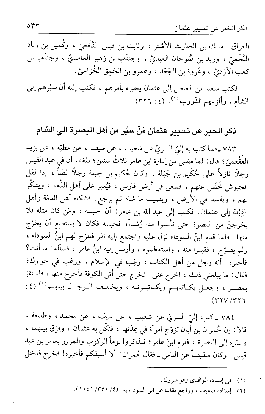 ٧٨٣ - مما كتب به إليّ السريّ عن شعيب، عن سيف، عن عطيّة، عن يزيد الفَقْعميّ؛ قال: لما مضى من إمارة ابن عامر ثلاثُ سنين؛ بلغه: أن في عبد القيس رجلًا نازلًا على حُكَيم بن جَبَلة، وكان حُكيم بن جبلة رجلًا لصًّا، إذا قفل الجيوش خَنَس عنهم، فسعى في أرض فارس، فيُغير على أهل الذّمة، ويتنكّر لهم، ويفسد في الأرض، ويصيب ما شاء ثم يرجع. فشكاه أهل الذمّه وأهل القِبْلة إلى عثمان. فكتب إلى عبد الله بن عامر: أن احبسه، ومَن كان مثله فلا يخرجنّ من البصرة حتى تأنسوا منه رُشْدًا؛ فحبسه فكان لا يستطيع أن يخرُج منها. فلما قدم ابنُ السوداء نزل عليه واجتمع إليه نفر فطرَح لهم ابنُ السوداء، ولم يصرّح، فقبلوا منه، واستعظموه، وأرسل إليه ابنُ عامر، فسأله: ما أنت؟ فأخبره: أنه رجل من أهل الكتاب، رغِب في الإسلام، ورغب في جوارك؛ فقاله. ما يبلغني ذلك، اخرج عني. فخرج حتى أتى الكوفة فأخرج منها، فاستقرّ بمصر، وجعل يكاتبهم ويكاتبونه، ويختلف الرجال بينهم (٢) (٤: ٣٢٦/ ٣٢٧).