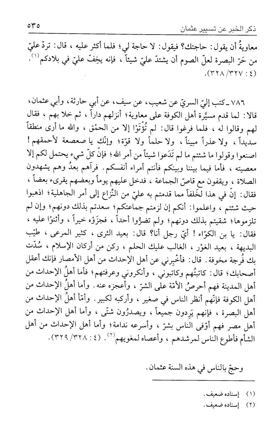 ٧٨٦ - كتب إليّ السريّ عن شعيب، عن سيف، عن أبي حارثة، وأبي عثمان، قالا؛ لما قدم مسيَّرة أهل الكوفة على معاوية؛ أنزلهم دارًا، ثم خلا بهم، فقال لهم وقالوا له، فلما فرغوا قال: لم تُؤْتَوْا إلَّا من الحمْق، والله ما أرى منطقًا سديدًا، ولا عذرًا مبينًا، ولا حلمًا ولا قوّة؛ وإنّك يا صعصعة لأحمقهم! اصنعوا وقولوا ما شئتم ما لم تَدَعوا شيئًا من أمر الله؛ فإنّ كلّ شيء يحتمل لكم إلَّا معصيته، فأما فيما بيننا وبينكم فأنتم أمراء أنفسكم. فرآهم بعدُ وهم يشهدون الصلاة، ويقفون مع قاصّ الجماعة، فدخل عليهم يومًا وبعضهم يقرئ بعضًا، فقال: إنّ في هذا لخَلفًا مما قدمتم به عليّ من النِّزاع إلى أمر الجاهلية؛ اذهبوا حيث شئتم، واعلموا: أنكم إن لزمتم جماعتكم؛ سعدتم بذلك دونهم؛ وإن لم تلزموها؛ شقيتم بذلك دونهم؛ ولم تضرُّوا أحدًا، فجزَوْه خيرًا، وأثنوْا عليه، فقال: يا بن الكوّاء! أيّ رجل أنا؟ قال: بعيد الثرى، كثير المرعى، طيّب البديهة، بعيد الغوْر، الغالب عليك الحلم، ركن من أركان الإسلام، سُدّت بك فُرجة مخوفة. قال: فأخْبِرني عن أهل الإحداث من أهل الأمصار فإنك أعقل أصحابك؛ قال: كاتبتُهم وكاتبوني، وأنكروني وعرفتهم؛ فأما أهلُ الإحداث من أهل المدينة فهم أحرصُ الأمّة على الشرّ، وأعجزه عنه. وأما أهلُ الإحداث من أهل الكوفة فإنّهم أنظر الناس في صغير، وأركبه لكبير. وأمّا أهلُ الإحداث من أهل البصرة، فإنهم يَرِدون جميعًا، ويصدرُون شتّى، وأما أهل الإحداث من أهل مصر فهم أوْفى الناس بشرّ، وأسرعه ندامة؛ وأما أهل الإحداث من أهل الشأم فأطوع الناس لمرشدهم، وأعصاه لمغويهم (٢). (٤: ٣٢٨/ ٣٢٩).