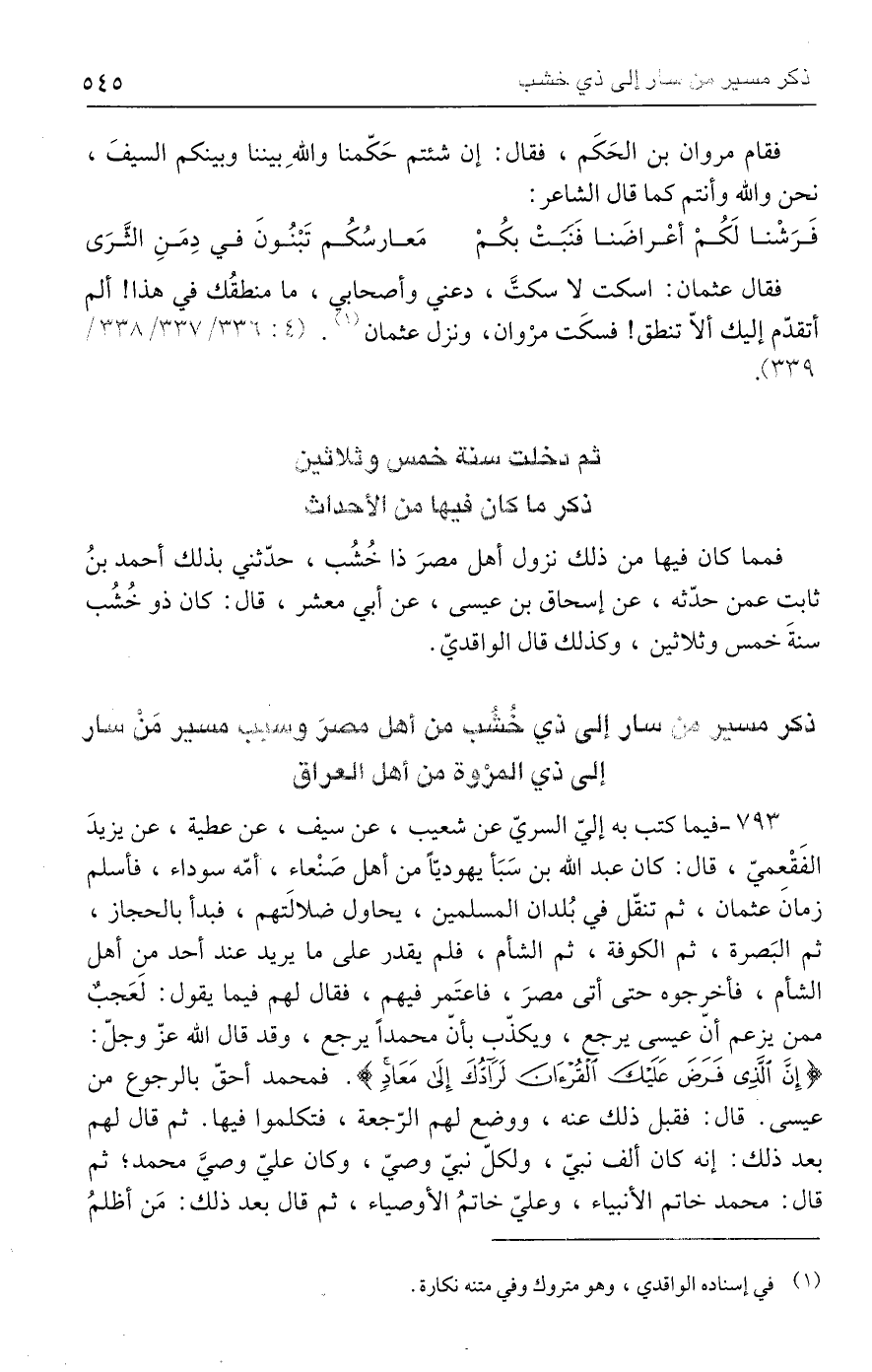 فمما كان فيها من ذلك نزول أهل مصرَ ذا خُشُب، حدّثني بذلك أحمد بنُ ثابت عمن حدّثه، عن إسحاق بن عيسى، عن أبي معشر، قال: كان ذو خُشُب سنةَ خمس وثلاثين، وكذلك قال الواقديّ.
