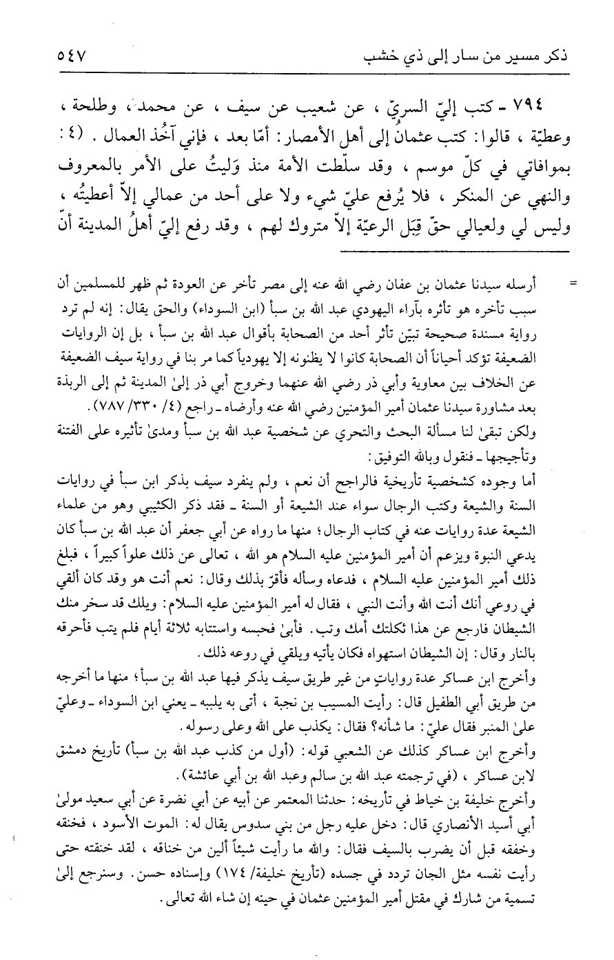٧٩٤ - كتب إليّ السريّ، عن شعيب عن سيف، عن محمد، وطلحة، وعطيّة، قالوا: كتب عثمانُ إلى أهل الأمصار: أمّا بعد، فإني آخُذ العمال. (٤: ) بموافاتي في كلّ موسم، وقد سلّطت الأمة منذ وَليتُ على الأمر بالمعروف والنهي عن المنكر، فلا يُرفع عليّ شيء ولا على أحد من عمالي إلَّا أعطيتُه، وليس لي ولعيالي حقّ قِبَل الرعيّة إلَّا متروك لهم، وقد رفع إليّ أهلُ المدينة أنّ