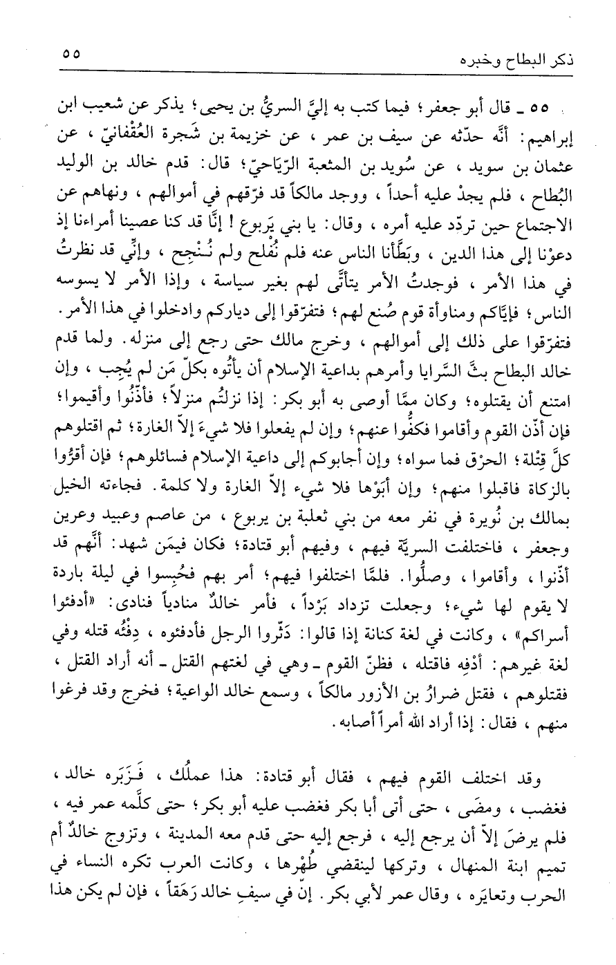 ٥٥ - قال أبو جعفر؛ فيما كتب به إليَّ السريُّ بن يحيى؛ يذكر عن شعيب ابن إبراهيم: أنَّه حدّثه عن سيف بن عمر، عن خزيمة بن شَجرة العُقْفانيّ، عن عثمان بن سويد، عن سُويد بن المثعبة الرّيَاحيّ؛ قال: قدم خالد بن الوليد البُطاح، فلم يجدْ عليه أحدًا، ووجد مالكًا قد فرّقهم في أموالهم، ونهاهم عن الاجتماع حين تردّد عليه أمره، وقال: يا بني يَربوع! إنَّا قد كنا عصينا أمراءنا إذ دعوْنا إلى هذا الدين، وبَطَّأنا الناس عنه فلم نُفْلح ولم نُنْجِح، وإنِّي قد نظرتُ في هذا الأمر، فوجدتُ الأمر يتأتَّى لهم بغير سياسة، وإذا الأمر لا يسوسه الناس؛ فإيَّاكم ومناوأة قوم صُنع لهم؛ فتفرّقوا إلى دياركم وادخلوا في هذا الأمر. فتفرّقوا على ذلك إلى أموالهم، وخرج مالك حتى رجع إلى منزله. ولما قدم خالد البطاح بثَّ السَّرايا وأمرهم بداعية الإسلام أن يأتُوه بكلّ مَن لم يُجِب، وإن امتنع أن يقتلوه، وكان ممَّا أوصى به أبو بكر: إذا نزلتُم منزلًا؛ فأذّنُوا وأقيموا؛ فإن أذّن القوم وأقاموا فكفُّوا عنهم؛ وإن لم يفعلوا فلا شيءَ إلّا الغارة؛ ثم اقتلوهم كلَّ قِتْلة؛ الحرْق فما سواه؛ وإن أجابوكم إلى داعية الإسلام فسائلوهم؛ فإن أقرُّوا بالزكاة فاقبلوا منهم؛ وإن أبَوْها فلا شيء إلّا الغارة ولا كلمة. فجاءته الخيل بمالك بن نُويرة في نفر معه من بني ثعلبة بن يربوع، من عاصم وعبيد وعرين وجعفر، فاختلفت السريّة فيهم، وفيهم أبو قتادة؛ فكان فيمَن شهد: أنَّهم قد أذّنوا، وأقاموا، وصلُّوا. فلمَّا اختلفوا فيهم، أمر بهم فحُبِسوا في ليلة باردة لا يقوم لها شيء؛ وجعلت تزداد بَرْدًا، فأمر خالدٌ مناديًا فنادى: "أدفئوا أسراكم"، وكانت في لغة كنانة إذا قالوا: دَثّروا الرجل فأدفئوه، دِفْئُه قتله وفي لغة غيرهم: أدْفِه فاقتله، فظنّ القوم - وهي في لغتهم القتل - أنه أراد القتل، فقتلوهم، فقتل ضرارُ بن الأزور مالكًا، وسمع خالد الواعية، فخرج وقد فرغوا منهم، فقال: إذا أراد الله أمرًا أصابه.