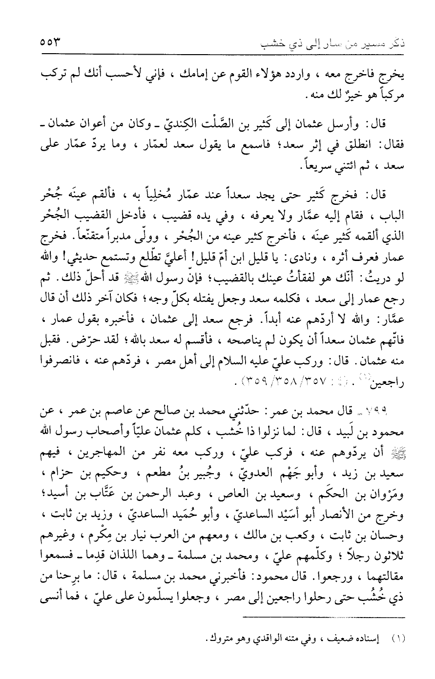 ٧٩٩ - قال محمد بن عمر: حدّثني محمد بن صالح عن عاصم بن عمر، عن محمود بن لَبيد، قال: لما نزلوا ذا خُشب، كلم عثمان عليًّا وأصحاب رسول الله - صلى الله عليه وسلم - أن يردّوهم عنه، فركب عليّ، وركب معه نفر من المهاجرين، فيهم سعيد بن زيد، وأبو جَهْم العدويّ، وجُبير بنُ مطعم، وحكيم بن حزام، ومَرْوان بن الحكَم، وسعيد بن العاص، وعبد الرحمن بن عَتَّاب بن أسيد؛ وخرج من الأنصار أبو أسَيْد الساعديّ، وأبو حُمَيد الساعديّ، وزيد بن ثابت، وحسان بن ثابت، وكعب بن مالك، ومعهم من العرب نيار بن مِكْرم، وغيرهم ثلاثون رجلًا؛ وكلّمهم عليّ، ومحمد بن مسلمة - وهما اللذان قدِما - فسمعوا مقالتهما، ورجعوا. قال محمود: فأخبرني محمد بن مسلمة، قال: ما برِحنا من ذي خُشُب حتى رحلوا راجعين إلى مصر، وجعلوا يسلّمون على عليّ، فما أنسى