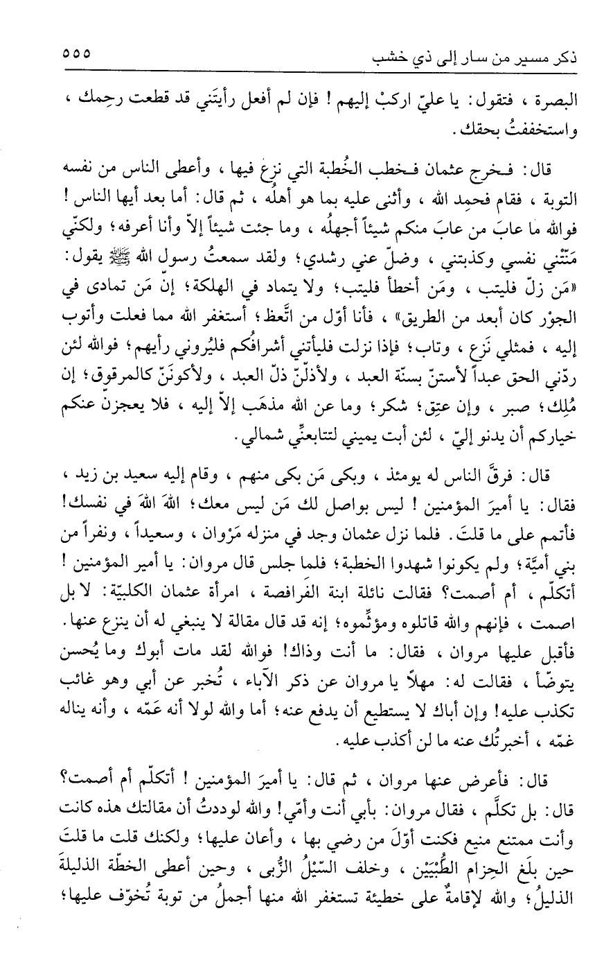 قال: فرقَّ الناس له يومئذ، وبكى مَن بكى منهم، وقام إليه سعيد بن زيد، فقال: يا أميرَ المؤمنين! ليس بواصل لك مَن ليس معك؛ اللهَ اللهَ في نفسك! فأتمم على ما قلتَ. فلما نزل عثمان وجد في منزله مَرْوان، وسعيدًا، ونفرًا من بني أميَّة؛ ولم يكونوا شهدوا الخطبة؛ فلما جلس قال مروان: يا أمير المؤمنين! أتكلّم، أم أصمت؟ فقالت نائلة ابنة الفَرافصة، امرأة عثمان الكلبيّة: لا بل اصمت، فإنهم والله قاتلوه ومؤثِّموه؛ إنه قد قال مقالة لا ينبغي له أن ينزع عنها. فأقبل عليها مروان، فقال: ما أنت وذاك! فوالله لقد مات أبوك وما يُحسن يتوضّأ، فقالت له: مهلًا يا مروان عن ذكر الآباء، تُخبر عن أبي وهو غائب تكذب عليه! وإن أباك لا يستطيع أن يدفع عنه؛ أما والله لولا أنه عَمّه، وأنه يناله غمّه، أخبرتُك عنه ما لن أكذب عليه.