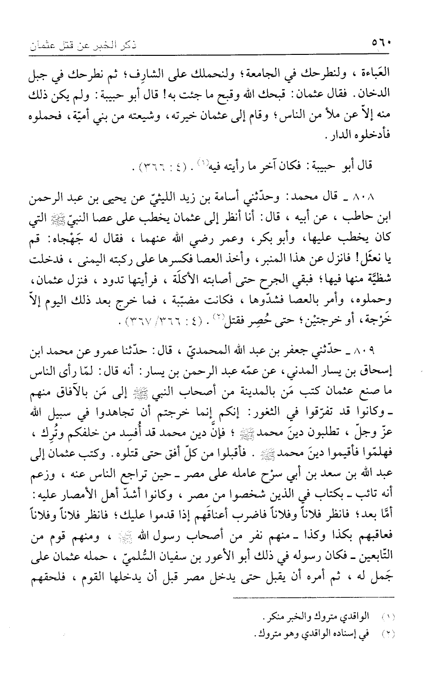 ٨٠٩ - حدّثني جعفر بن عبد الله المحمديّ، قال: حدّثنا عمرو عن محمد بن إسحاق بن يسار المدني، عن عمّه عبد الرحمن بن يسار: أنه قال: لمَّا رأى الناس ما صنع عثمان كتب مَن بالمدينة من أصحاب النبي - صلى الله عليه وسلم - إلى مَن بالآفاق منهم - وكانوا قد تفرّقوا في الثغور: إنكم إنما خرجتم أن تجاهدوا في سبيل الله عزّ وجلّ، تطلبون دينَ محمد - صلى الله عليه وسلم - فإنَّ دين محمد قد أُفسِد من خلفكم وتُرِك، فهلمّوا فأقيموا دينَ محمد - صلى الله عليه وسلم -. فأقبلوا من كلّ أفق حتى قتلوه. وكتب عثمان إلى عبد الله بن سعد بن أبي سرْح عامله على مصر - حين تراجع الناس عنه، وزعم أنه تائب - بكتاب في الذين شخصوا من مصر، وكانوا أشدّ أهل الأمصار عليه: أمَّا بعد؛ فانظر فلانًا وفلانًا فاضرب أعناقَهم إذا قدموا عليك؛ فانظر فلانًا وفلانًا فعاقبهم بكذا وكذا - منهم نفر من أصحاب رسول الله - صلى الله عليه وسلم -، ومنهم قوم من التّابعين - فكان رسوله في ذلك أبو الأعور بن سفيان السُّلميّ، حمله عثمان على جَمل له، ثم أمره أن يقبل حتى يدخل مصر قبل أن يدخلها القوم، فلحقهم