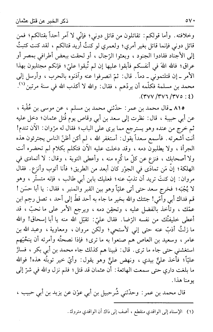 ٨١٥ - قال محمد بن عمر: حدّثني محمد بن مسلم، عن موسى بن عُقْبة، عن أبي حبيبة، قال: نظرت إلى سعد بن أبي وقاص يوم قُتل عثمان؛ دخل عليه ثم خرج من عنده وهو يسترجع مما يرى على الباب؛ فقال له مرْوان: الآن تندم! أنت أشعرته. فأسمع سعدًا يقول: أستغفر الله، لم أكن أظنّ الناس يجترئون هذه الجرأة، ولا يطلبون دمه، وقد دخلت عليه الآن فتكلم بكلام لم تحضره أنت ولا أصحابك، فنزع عن كلّ ما كُرِه منه، وأعطى التوبة، وقال: لا أتمادى في الهلكة؛ إن مَن تمادَى في الجوْر كان أبعد من الطريق؛ فأنا أتوب وأنزع. فقال مروان: إن كنتَ تريد أن تذبّ عنه؛ فعليك بابن أبي طالب، فإنه متستّر، وهو لا يُجْبَه؛ فخرج سعد حتى أتى عليًّا وهو بين القبر والمنبر، فقال: يا أبا حسَن! قم فداك أبي وأمّي! جئتك والله بخير ما جاء به أحد قطّ إلى أحد، تصل رحِم ابن عمّك، وتأخذ بالفضل عليه، وتحقِن دمه، ويرجع الأمر على ما نحبّ، قد أعطى خليفتُك من نفسه الرّضا. فقال عليّ: تقبّل الله منه يا أبا إسحاق! والله ما زلتُ أذبّ عنه حتى إني لأستحي؛ ولكن مروان، ومعاوية، وعبد الله بن عامر، وسعيد بن العاص هم صنعوا به ما ترى؛ فإذا نصحتُه وأمرته أن ينحِّيَهم استغشني حتى جاء ما ترى. قال: فبينا هم كذلك جاء محمد بن أبي بكر، فسارَّ عليًّا؛ فأخذ عليٌّ بيدي، ونهض عليّ وهو يقول: وأيّ خير توبتُه هذه! فوالله ما بلغت داري حتى سمعت الهائعة: أن عثمان قد قتل؛ فلم نزل والله في شرّ إلى يومنا هذا.
