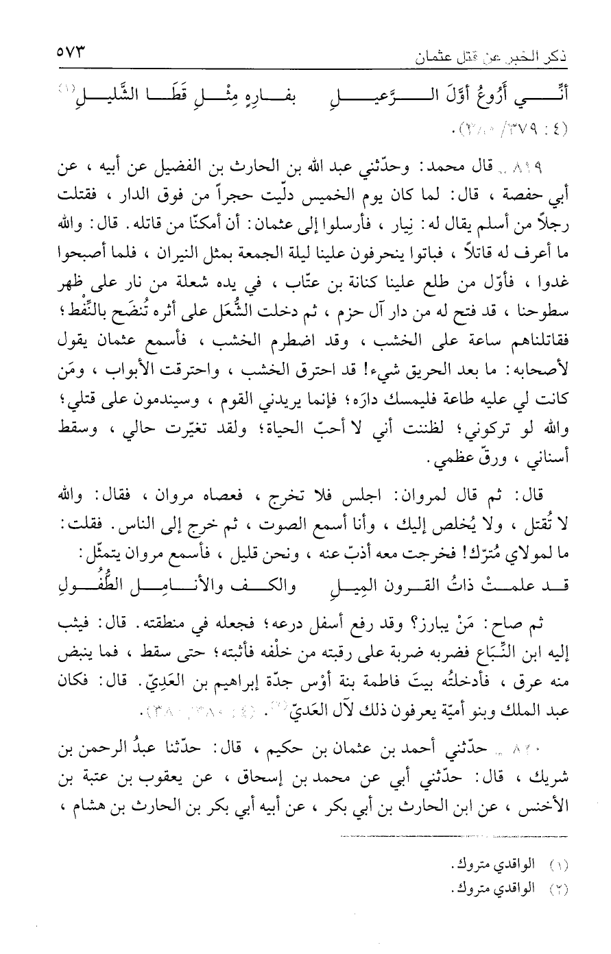 ٨١٩ - قال محمد: وحدّثني عبد الله بن الحارث بن الفضيل عن أبيه، عن أبي حفصة، قال: لما كان يوم الخميس دلّيت حجرًا من فوق الدار، فقتلت رجلًا من أسلم يقال له: نِيار، فأرسلوا إلى عثمان: أن أمكنّا من قاتله. قال: والله ما أعرف له قاتلًا، فباتوا ينحرفون علينا ليلة الجمعة بمثل النيران، فلما أصبحوا غدوا، فأوّل من طلع علينا كنانة بن عتّاب، في يده شعلة من نار على ظهر سطوحنا، قد فتح له من دار آل حزم، ثم دخلت الشُّعَل على أثره تُنضح بالنِّفْط؛ فقاتلناهم ساعة على الخشب، وقد اضطرم الخشب، فأسمع عثمان يقول لأصحابه: ما بعد الحريق شيء! قد احترق الخشب، واحترقت الأبواب، ومَن كانت لي عليه طاعة فليمسك دارَه؛ فإنما يريدني القوم، وسيندمون على قتلي؛ والله لو تركوني؛ لظننت أني لا أحبّ الحياة؛ ولقد تغيّرت حالي، وسقط أسناني، ورقّ عظمي.