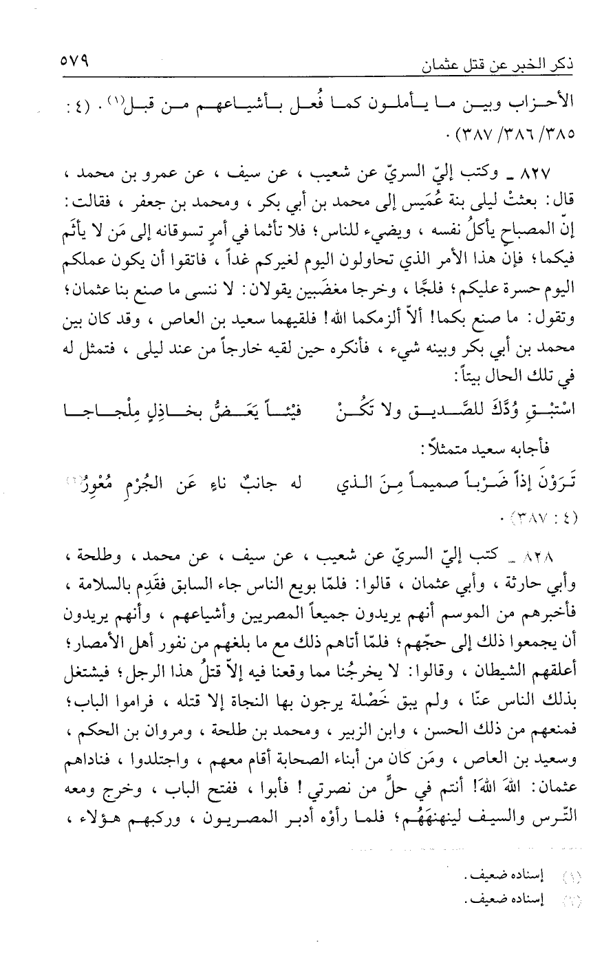 ٨٢٧ - وكتب إليّ السريّ عن شعيب، عن سيف، عن عمرو بن محمد، قال: بعثتْ ليلى بنة عُمَيس إلى محمد بن أبي بكر، ومحمد بن جعفر، فقالت: إنّ المصباح يأكلُ نفسه، ويضيء للناس؛ فلا تأثما في أمرٍ تسوقانه إلى مَن لا يأثَم فيكما؛ فإنَّ هذا الأمر الذي تحاولون اليوم لغيركم غدًا، فاتقوا أن يكون عملكم اليوم حسرة عليكم؛ فلجَّا، وخرجا مغضَبين يقولان: لا ننسى ما صنع بنا عثمان؛ وتقول: ما صنع بكما! ألَّا ألزمكما الله! فلقيهما سعيد بن العاص، وقد كان بين محمد بن أبي بكر وبينه شيء، فأنكره حين لقيه خارجًا من عند ليلى، فتمثل له في تلك الحال بيتًا: