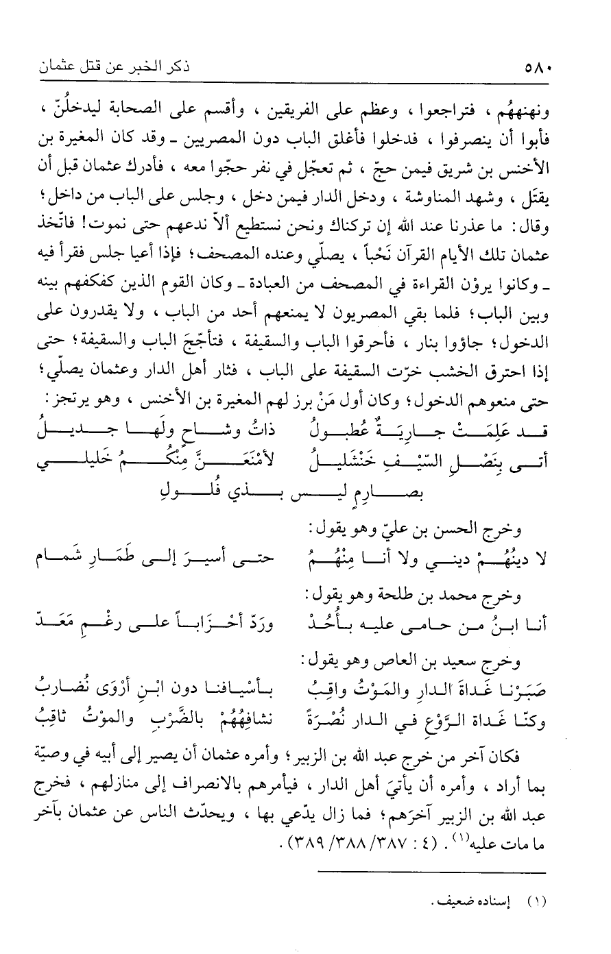 فكان آخر من خرج عبد الله بن الزبير؛ وأمره عثمان أن يصير إلى أبيه في وصيّة بما أراد، وأمره أن يأتيَ أهل الدار، فيأمرهم بالانصراف إلى منازلهم، فخرج عبد الله بن الزبير آخرَهم؛ فما زال يدّعي بها، ويحدّث الناس عن عثمان بآخر ما مات عليه (١). (٤: ٣٨٧/ ٣٨٨ / ٣٨٩).