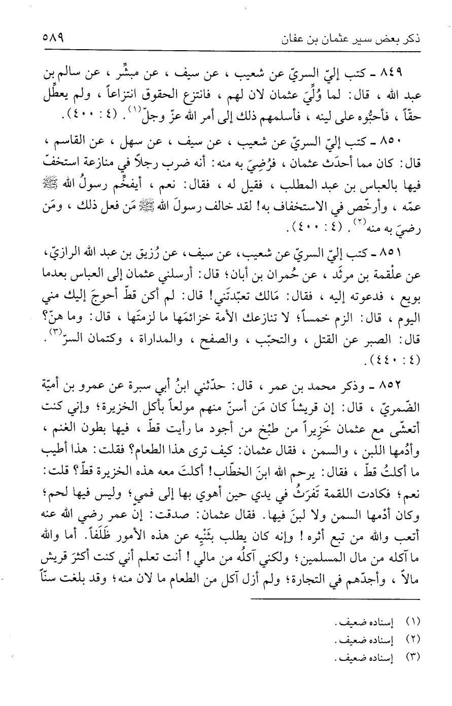 ٨٤٩ - كتب إليّ السريّ عن شعيب، عن سيف، عن مبشر، عن سالم بن عبد الله، قال: لما وُلِّيَ عثمان لان لهم، فانتزع الحقوق انتزاعًا، ولم يعطِّل حقًّا، فأحبُّوه على لينه، فأسلمهم ذلك إلى أمر الله عزّ وجلّ (١). (٤: ٤٠).