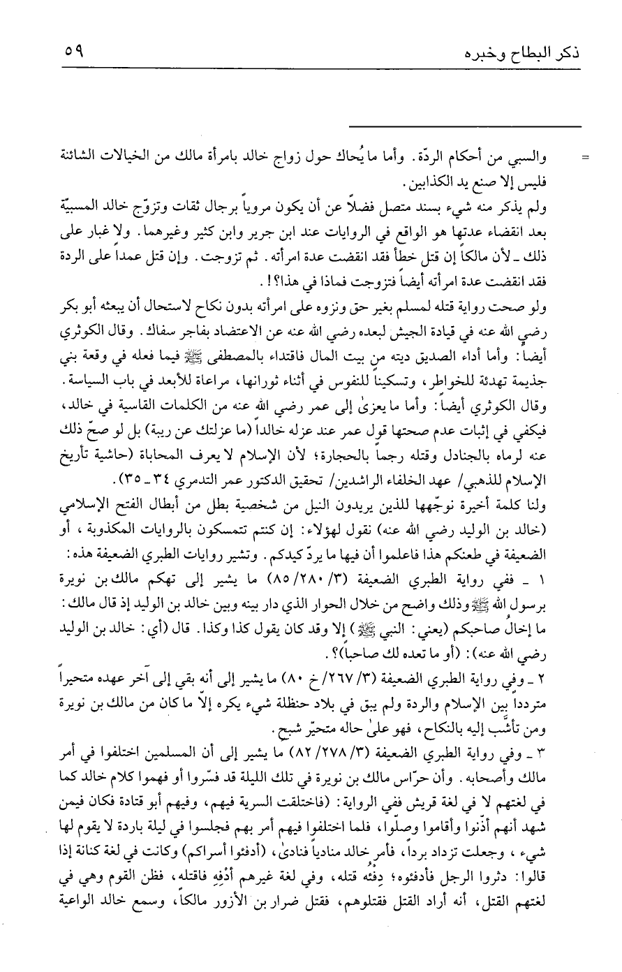 ولم يذكر منه شيء بسند متصل فضلًا عن أن يكون مرويًّا برجال ثقات وتزوّج خالد المسبيّة بعد انقضاء عدتها هو الواقع في الروايات عند ابن جرير وابن كثير وغيرهما. ولا غبار على ذلك - لأن مالكًا إن قتل خطأ فقد انقضت عدة امرأته. ثم تزوجت. وإن قتل عمدًا على الردة فقد انقضت عدة امرأته أيضًا فتزوجت فماذا في هذا؟ ! .