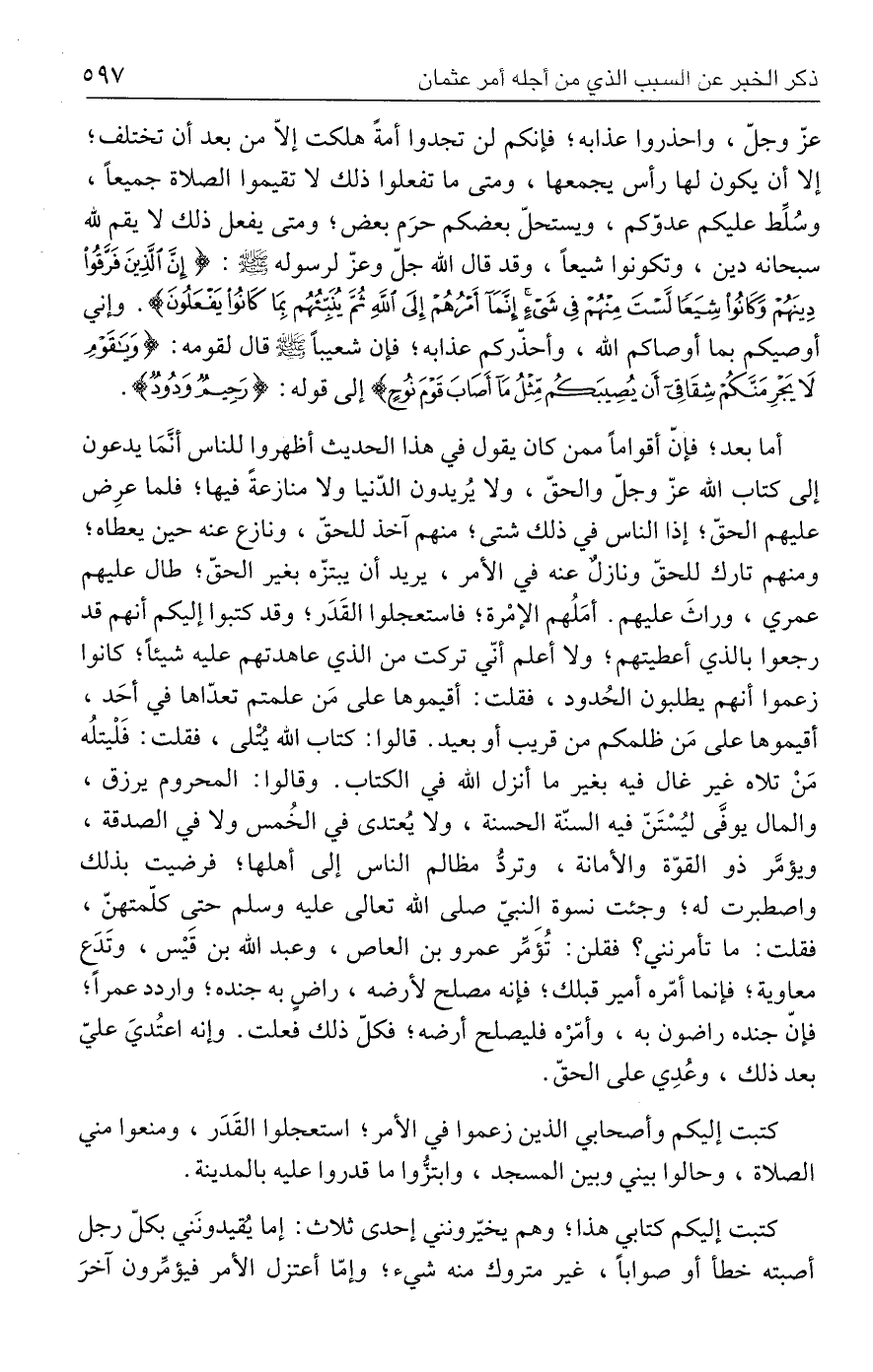 عزّ وجلّ، واحذروا عذابه؛ فإنكم لن تجدوا أمةً هلكت إلّا من بعد أن تختلف؛ إلا أن يكون لها رأس يجمعها، ومتى ما تفعلوا ذلك لا تقيموا الصلاة جميعًا، وسُلِّط عليكم عدوّكم، ويستحلّ بعضكم حرَم بعض؛ ومتى يفعل ذلك لا يقم لله سبحانه دين، وتكونوا شيعًا، وقد قال الله جلّ وعزّ لرسوله - صلى الله عليه وسلم -: {إِنَّ الَّذِينَ فَرَّقُوا دِينَهُمْ وَكَانُوا شِيَعًا لَسْتَ مِنْهُمْ فِي شَيْءٍ إِنَّمَا أَمْرُهُمْ إِلَى اللَّهِ ثُمَّ يُنَبِّئُهُمْ بِمَا كَانُوا يَفْعَلُونَ}. وإني أوصيكم بما أوصاكم الله، وأحذّركم عذابه؛ فإن شعيبًا - صلى الله عليه وسلم - قال لقومه: {وَيَاقَوْمِ لَا يَجْرِمَنَّكُمْ شِقَاقِي أَنْ يُصِيبَكُمْ مِثْلُ مَا أَصَابَ قَوْمَ نُوحٍ} إلى قوله: {رَحِيمٌ وَدُودٌ}.