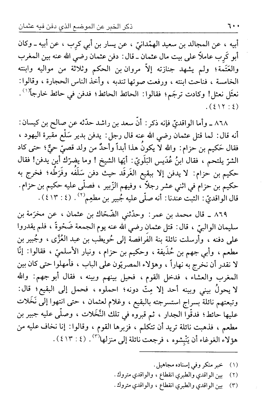 ٨٦٩ - قال محمد بن عمر: وحدّثني الضّحّاك بن عثمان، عن مخرَمة بن سليمان الوالبيّ، قال: قتل عثمان رضي الله عنه يوم الجمعة ضحْوةً، فلم يقدروا على دفنه، وأرسلت نائلة بنة الفَرافصة إلى حُويطب بن عبد العُزَّى، وجُبير بن مطعم، وأبي جهم بن حُذَيفة، وحكيم بن حزام، ونيار الأسلميّ، فقالوا: إنّا لا نقدر أن نخرج به نهارًا، وهؤلاء المصريّون على الباب، فأمهلوا حتى كان بين المغرب والعشاء، فدخل القوم، فحيل بينهم وبينه، فقال أبو جهم: والله لا يحولُ بيني وبينه أحد إلا مِتّ دونه؛ احملوه، فحمل إلى البقيع؛ قال: وتبعتهم نائلة بسراج استسرجته بالبقيع، وغلام لعثمان، حتى انتهوا إلى نَخَلات عليها حائط؛ فدقّوا الجدار، ثم قبروه في تلك النَّخَلات، وصلّى عليه جبير بن مطعم، فذهبت نائلة تريد أن تتكلم، فزبرها القوم، وقالوا: إنا نخاف عليه من هؤلاء الغوغاء أن يَنْبِشوه، فرجعت نائلة إلى منزلها (٣). (٤: ٤١٣).