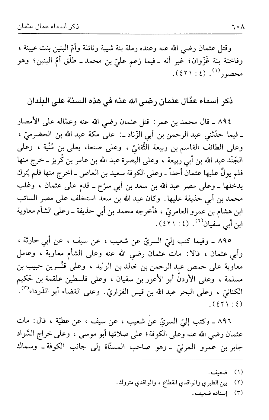 ٨٩٥ - وفيما كتب إليّ السريّ عن شعيب، عن سيف، عن أبي حارثة، وأبي عثمان، قالا: مات عثمان رضي الله عنه وعلى الشأم معاوية، وعامل معاوية على حمص عبد الرحمن بن خالد بن الوليد، وعلى قنَّسرين حبيب بن مسلمة، وعلى الأردن أبو الأعور بن سفيان، وعلى فلسطين علقمة بن حَكيم الكنانيّ، وعلى البحر عبد الله بن قيس الفزاريّ. وعلى القضاء أبو الدّرداء (٣). (٤: ٤٢١).