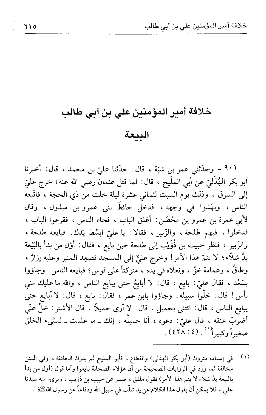 ٩٠١ - وحدّثني عمر بن شبّة، قال: حدّثنا عليّ بن محمد، قال: أخبرنا أبو بكر الهُذَليّ عن أبي الملَيح، قال: لما قتل عثمان رضي الله عنه؛ خرج عليّ إلى السوق، وذلك يوم السبت لثماني عشرة ليلة خلت من ذي الحجة، فاتّبعه الناس، وبهَشوا في وجهه، فدخل حائطَ بني عمرو بن مبذول، وقال لأبي عمرة بن عمرو بن محْصَن: أغلق الباب، فجاء الناس، فقرعوا الباب، فدخلوا، فيهم طلحة، والزّبير، فقالا: يا عليّ ابسُط يَدك. فبايعه طلحة، والزّبير، فنظر حبيب بن ذُؤَيْب إلى طلحة حين بايع، فقال: أوّل من بدأ بالبَيْعة يدٌ شلّاء؛ لا يتمّ هذا الأمر! وخرج عليٌّ إلى المسجد فصعِد المنبر وعليه إزارٌ، وطاقٌ، وعمامة خزّ، ونعلاه في يده، متوكئًا على قوس؛ فبايعه الناس. وجاؤوا بسَعْد، فقال عليّ: بايع، قال: لا أبايعُ حتى يبايع الناس، والله ما عليك مني بأس! قال: خلّوا سبيله. وجاؤوا بابن عمر، فقال: بايع، قال: لا أبايع حتى يبايع الناس، قال: ائتني بحميل، قال: لا أرى حميلًا، قال الأشتر: خلَّ عنّي أضربْ عنقه، قال عليّ: دعوه، أنا حميلُه، إنك - ما علمت - لسيِّئ الخلق صغيرًا وكبيرًا (١). (٤: ٤٢٨).