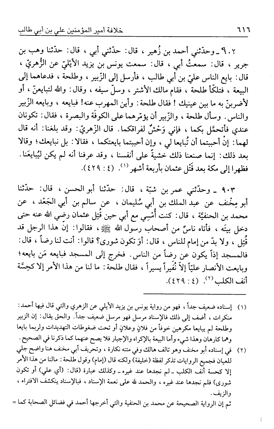 ٩٠٢ - وحدّثني أحمد بن زُهير، قال: حدّثني أبي، قال: حدّثنا وهب بن جرير، قال: سمعتُ أبي، قال: سمعت يونس بن يزيد الأيْليّ عن الزُهريّ، قال: بايع الناس عليّ بن أبي طالب، فأرسل إلى الزبير، وطلحة، فدعاهما إلى البيعة، فتلكّأ طلحة، فقام مالك الأشتر، وسلّ سيفه، وقال: والله لتبايعن، أو لأضربن به ما بين عينيك! فقال طلحة: وأين المهرب عنه! فبايعه، وبايعه الزّبير والناس. وسأل طلحة، والزبير أن يؤمّرهما على الكوفَة والبصرة، فقال: تكونان عندي فأتحمَّل بكما، فإني وَحْشٌ لفراقكما. قال الزّهريّ: وقد بلغنا: أنه قال لهما: إنْ أحببتما أن تُبايعا لي، وإن أحببتما بايعتكما، فقالا: بل نبايعك؛ وقالا بعد ذلك: إنما صنعنا ذلك خشية على أنفسنا، وقد عرفنا أنه لم يكن ليُبايعَنا. فظهرا إلى مكة بعد قَتْل عثمان بأربعة أشهر (١). (٤: ٤٢٩).