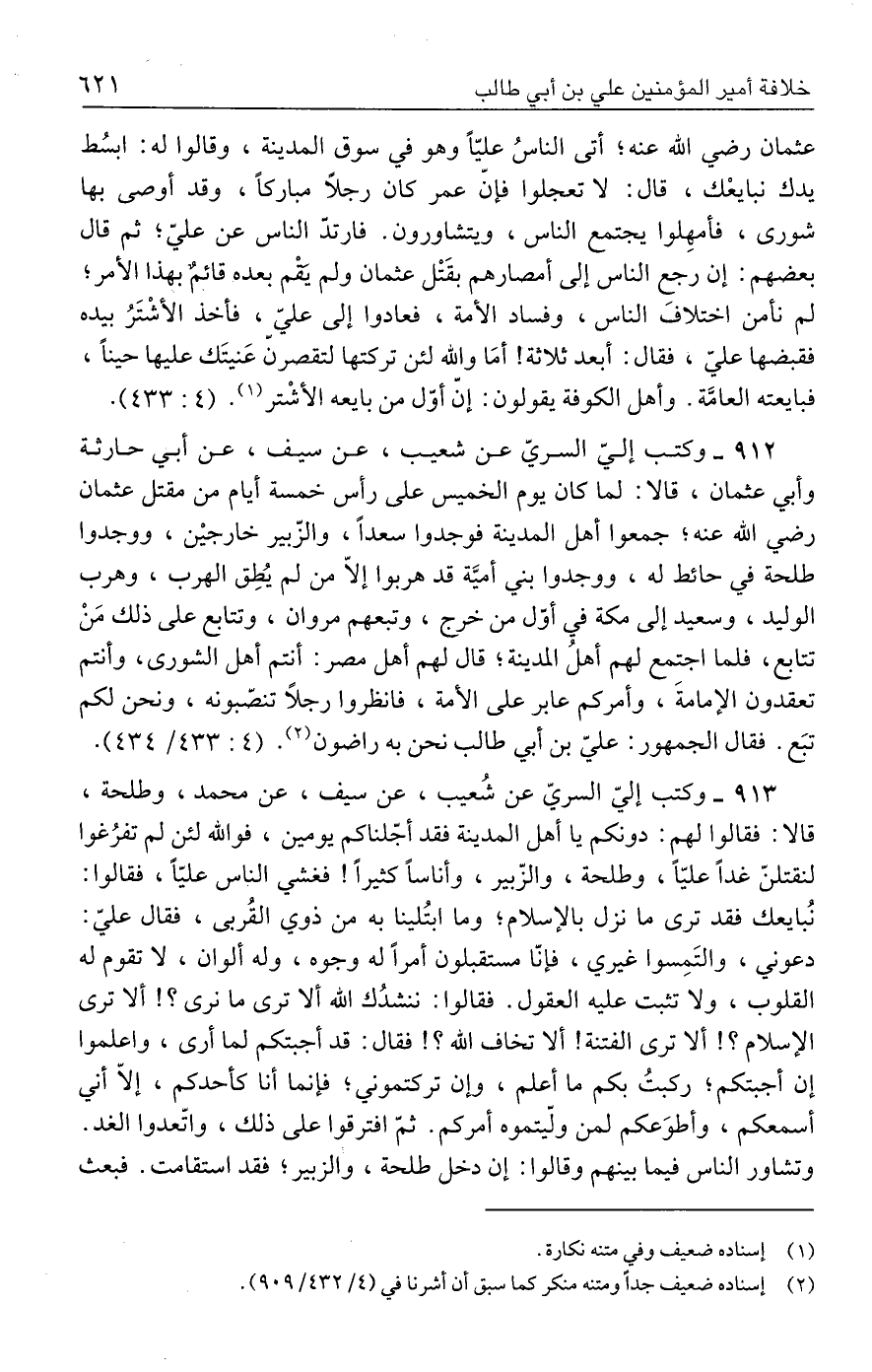 ٩١٢ - وكتب إليّ السريّ عن شعيب، عن سيف، عن أبي حارثة وأبي عثمان، قالا: لما كان يوم الخميس على رأس خمسة أيام من مقتل عثمان رضي الله عنه؛ جمعوا أهل المدينة فوجدوا سعدًا، والزّبير خارجيْن، ووجدوا طلحة في حائط له، ووجدوا بني أميَّة قد هربوا إلّا من لم يُطِق الهرب، وهرب الوليد، وسعيد إلى مكة في أوّل من خرج، وتبعهم مروان، وتتابع على ذلك مَنْ تتابع، فلما اجتمع لهم أهلُ المدينة، قال لهم أهل مصر: أنتم أهل الشورى، وأنتم تعقدون الإمامةَ، وأمركم عابر على الأمة، فانظروا رجلًا تنصّبونه، ونحن لكم تبَع. فقال الجمهور: عليّ بن أبي طالب نحن به راضون (٢). (٤: ٤٣٣/ ٤٣٤).