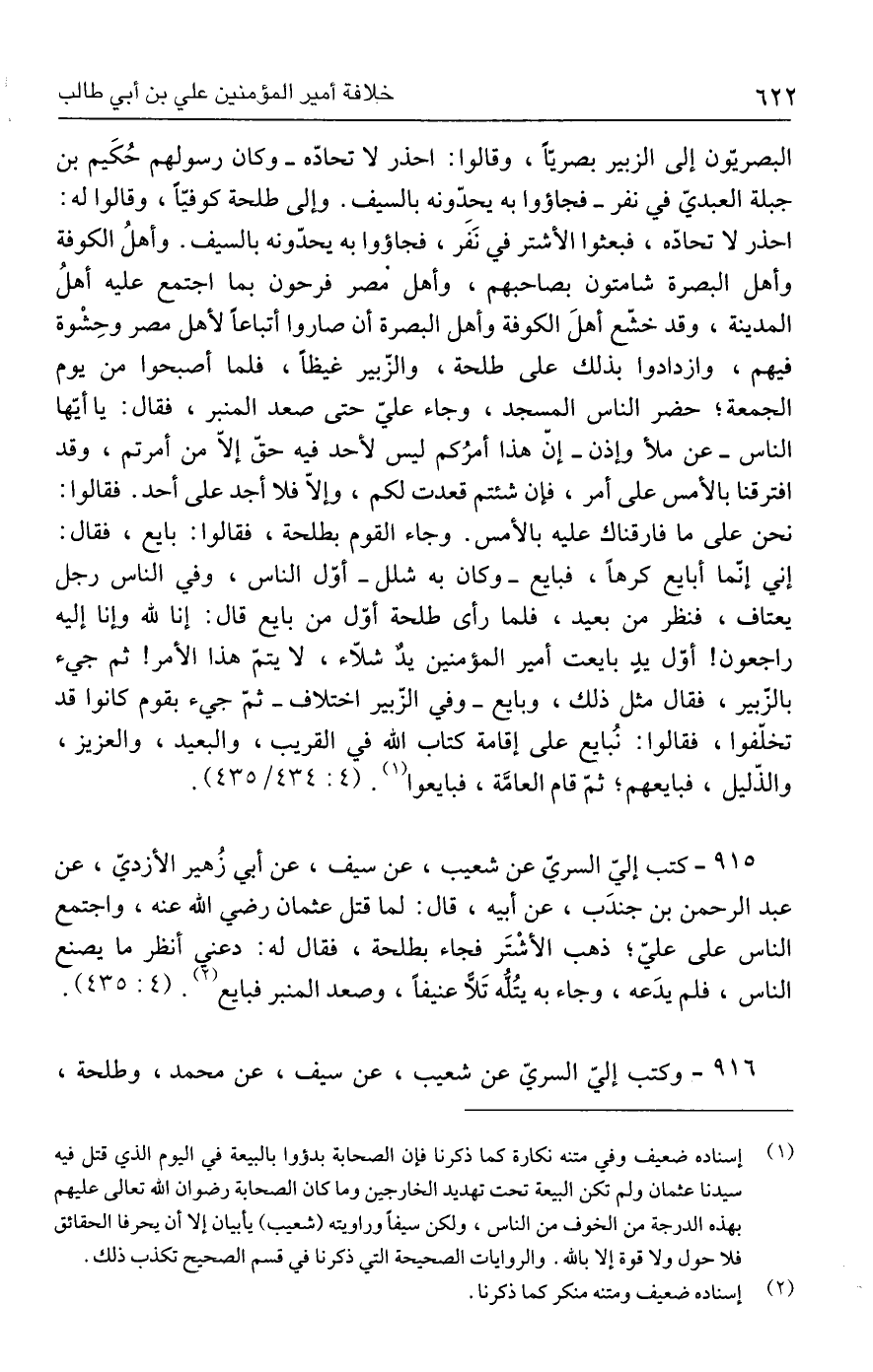 ٩١٥ - كتب إليّ السريّ عن شعيب، عن سيف، عن أبي زُهير الأزديّ، عن عبد الرحمن بن جندَب، عن أبيه، قال: لما قتل عثمان رضي الله عنه، واجتمع الناس على عليّ؛ ذهب الأشْتَر فجاء بطلحة، فقال له: دعنى أنظر ما يصنع الناس، فلم يدَعه، وجاء به يتُلُّه تَلًّا عنيفًا، وصعد المنبر فبايع (٢). (٤: ٤٣٥).