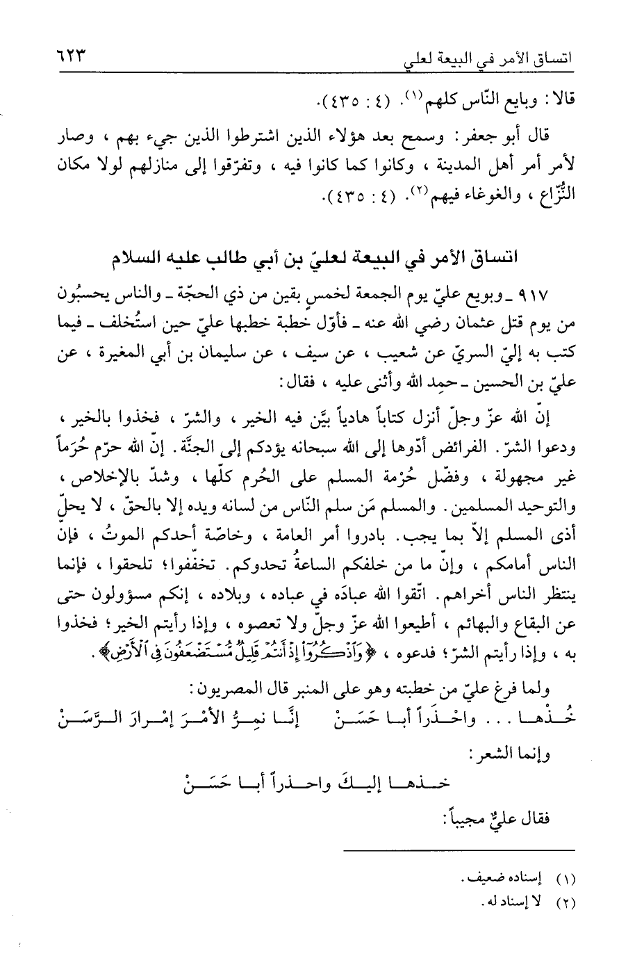 ٩١٧ - وبويع عليّ يوم الجمعة لخمسٍ بقين من ذي الحجّة -والناس يحسبُون من يوم قتل عثمان رضي الله عنه- فأوّل خطبة خطبها عليّ حين استُخلف -فيما كتب به إليّ السريّ عن شعيب، عن سيف، عن سليمان بن أبي المغيرة، عن عليّ بن الحسين- حمِد الله وأثنى عليه، فقال: