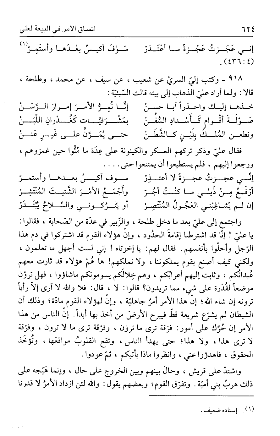 ٩١٨ - وكتب إليّ السريّ عن شعيب، عن سيف، عن محمد، وطلحة، قالا: ولما أراد عليّ الذهاب إلى بيته قالت السّبئيّة: