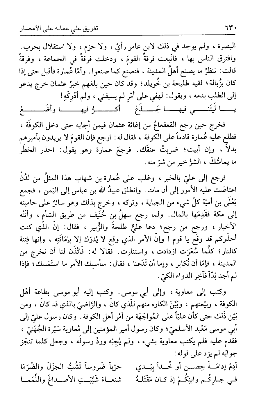 فرجع إلى عليّ بالخبر، وغلب على عُمارة بن شهاب هذا المثلُ من لدُنْ اعتاصَت عليه الأمور إلى أن مات. وانطلق عبيدُ الله بن عباس إلى اليَمن، فجمع يَعْلَى بن أميّة كلّ شيء من الجباية، وتركه، وخرج بذلك وهو سائرٌ على حاميته إلى مكة فقَدِمَها بالمال. ولما رجع سهلُ بن حُنيف من طريق الشأم، وأتَتْه الأخبار، ورجِع من رجع؛ دعا عليٌّ طلحةَ والزُّبير، فقال: إنّ الذي كنت أحذركم قد وقع يا قوم! وإنّ الأمر الذي وقع لا يُدرَك إلا بإمَاتَتِه، وإنها فِتنة كالنار؛ كلَّما سُعّرَت ازدادت، واستنارت. فقالا له: فَائْذَن لنا أن نخرج من المدينة، فإمّا أن نكابر، وإما أن تَدَعنا، فقال: سأمسِك الأمر ما استَمْسك؛ فإذا لم أجد بُدًّا فآخِر الدواء الكيّ.