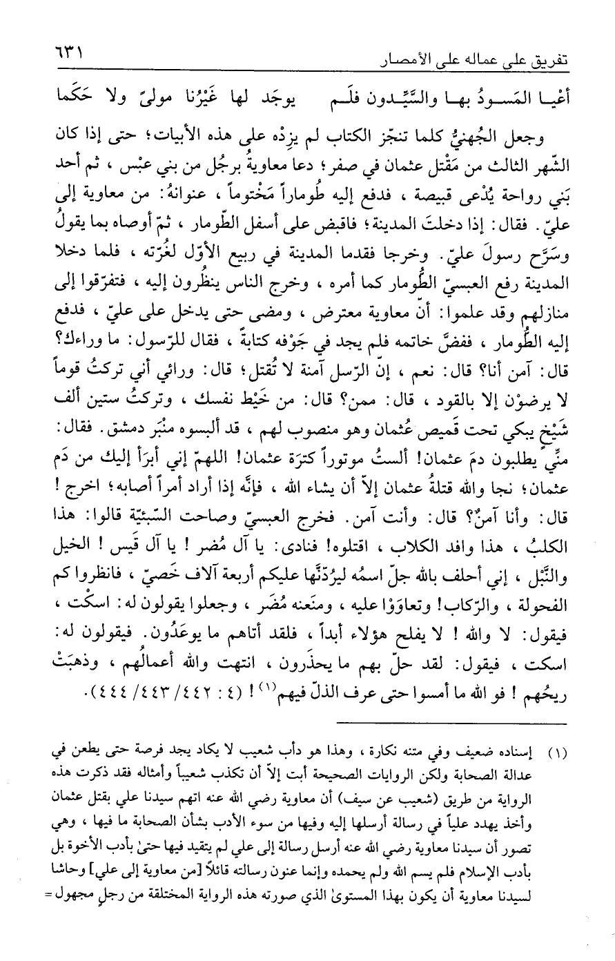 (١) إسناده ضعيف وفي متنه نكارة، وهذا هو دأب شعيب لا يكاد يجد فرصة حتى يطعن في عدالة الصحابة ولكن الروايات الصحيحة أبت إلّا أن تكذب شعيبًا وأمثاله فقد ذكرت هذه الرواية من طريق (شعيب عن سيف) أن معاوية رضي الله عنه اتهم سيدنا علي بقتل عثمان وأخذ يهدد عليًّا في رسالة أرسلها إليه وفيها من سوء الأدب بشأن الصحابة ما فيها، وهي تصور أن سيدنا معاوية رضي الله عنه أرسل رسالة إلى علي لم يتقيد فيها حتى بأدب الأخوة بل بأدب الإسلام فلم يسم الله ولم يحمده وإنما عنون رسالته قائلًا [من معاوية إلى علي] وحاشا لسيدنا معاوية أن يكون بهذا المستوى الذي صورته هذه الرواية المختلقة من رجلٍ مجهول =