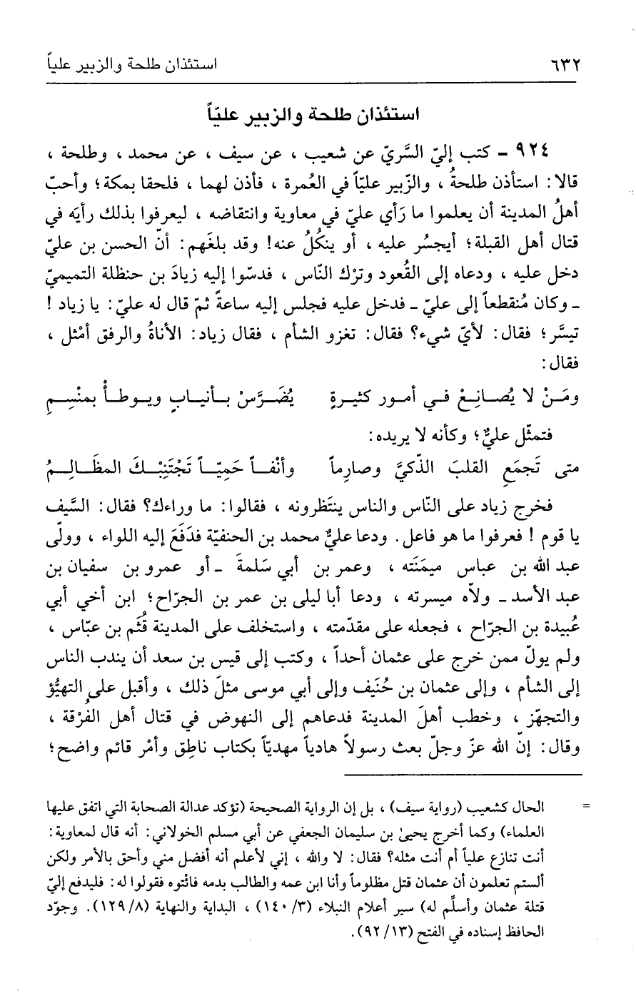 ٩٢٤ - كتب إليّ السَّريّ عن شعيب، عن سيف، عن محمد، وطلحة، قالا: استأذن طلحةُ، والزبير عليًّا في العُمرة، فأذن لهما، فلحقا بمكة؛ وأحبّ أهلُ المدينة أن يعلموا ما رَأي عليّ في معاوية وانتقاضه، ليعرفوا بذلك رأيَه في قتال أهل القبلة؛ أيجسُر عليه، أو ينكُلُ عنه! وقد بلغَهم: أن الحسن بن عليّ دخل عليه، ودعاه إلى القُعود وترْك النّاس، فدسّوا إليه زيادَ بن حنظلة التميمى -وكان مُنقطعًا إلى عليّ- فدخل عليه فجلس إليه ساعةً ثمّ قال له عليّ: يا زياد! تيسَّر؛ فقال: لأيّ شيء؟ فقال: تغزو الشأم، فقال زياد: الأناةُ والرفق أمْثل، فقال: