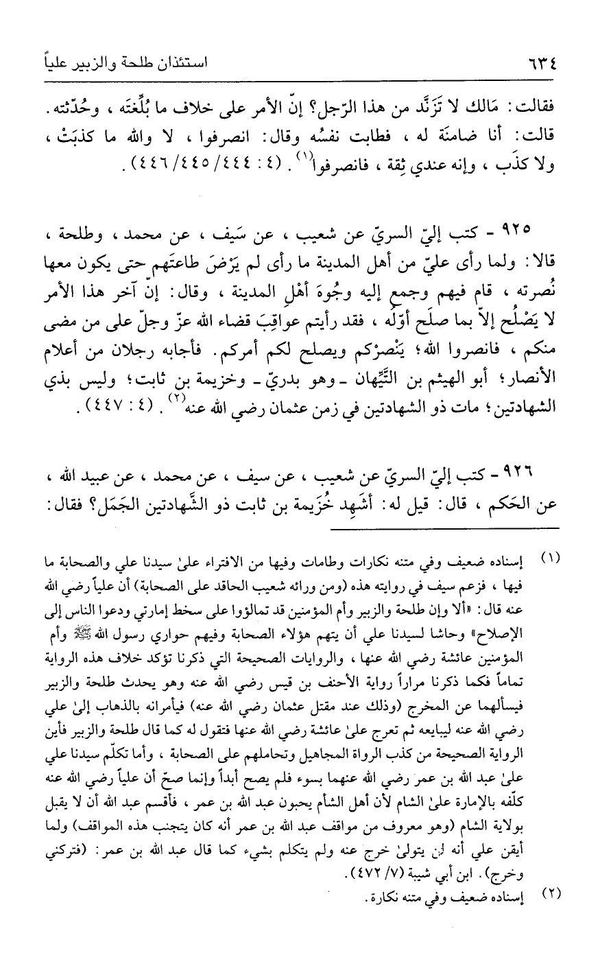 (١) إسناده ضعيف وفي متنه نكارات وطامات وفيها من الافتراء على سيدنا علي والصحابة ما فيها، فزعم سيف في روايته هذه (ومن ورائه شعيب الحاقد على الصحابة) أن عليًّا رضي الله عنه قال: "ألا وإن طلحة والزبير وأم المؤمنين قد تمالؤوا على سخط إمارتي ودعوا الناس إلى الإصلاح" وحاشا لسيدنا علي أن يتهم هؤلاء الصحابة وفيهم حواري رسول الله - صلى الله عليه وسلم -وأم المؤمنين عائشة رضي الله عنها، والروايات الصحيحة التي ذكرنا تؤكد خلاف هذه الرواية تمامًا فكما ذكرنا مرارًا رواية الأحنف بن قيس رضي الله عنه وهو يحدث طلحة والزبير فيسألهما عن المخرج (وذلك عند مقتل عثمان رضي الله عنه) فيأمرانه بالذهاب إلى علي رضي الله عنه ليبايعه ثم تعرج على عائشة رضي الله عنها فتقول له كما قال طلحة والزبير فأين الرواية الصحيحة من كذب الرواة المجاهيل وتحاملهم على الصحابة، وأما تكلّم سيدنا علي على عبد الله بن عمر رضي الله عنهما بسوء فلم يصح أبدًا وإنما صحّ أن عليًا رضي الله عنه كلّفه بالإمارة على الشام لأن أهل الشام يحبون عبد الله بن عمر، فأقسم عبد الله أن لا يقبل بولاية الشام (وهو معروف من مواقف عبد الله بن عمر أنه كان يتجنب هذه المواقف) ولما أيقن علي أنه لن يتولى خرج عنه ولم يتكلم بشيء كما قال عبد الله بن عمر: (فتركني وخرج). ابن أبي شيبة (٧/ ٤٧٢).