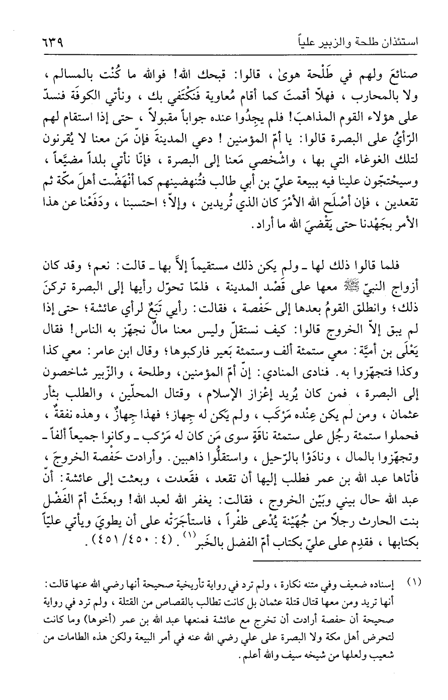 (١) إسناده ضعيف وفي متنه نكارة، ولم ترد في رواية تأريخية صحيحة أنها رضي الله عنها قالت: أنها تريد ومن معها قتال قتلة عثمان بل كانت تطالب بالقصاص من القتلة، ولم ترد في رواية صحيحة أن حفصة أرادت أن تخرج مع عائشة فمنعها عبد الله بن عمر (أخوها) وما كانت لتحرض أهل مكة ولا البصرة على علي رضي الله عنه في أمر البيعة ولكن هذه الطامات من شعيب ولعلها من شيخه سيف والله أعلم.