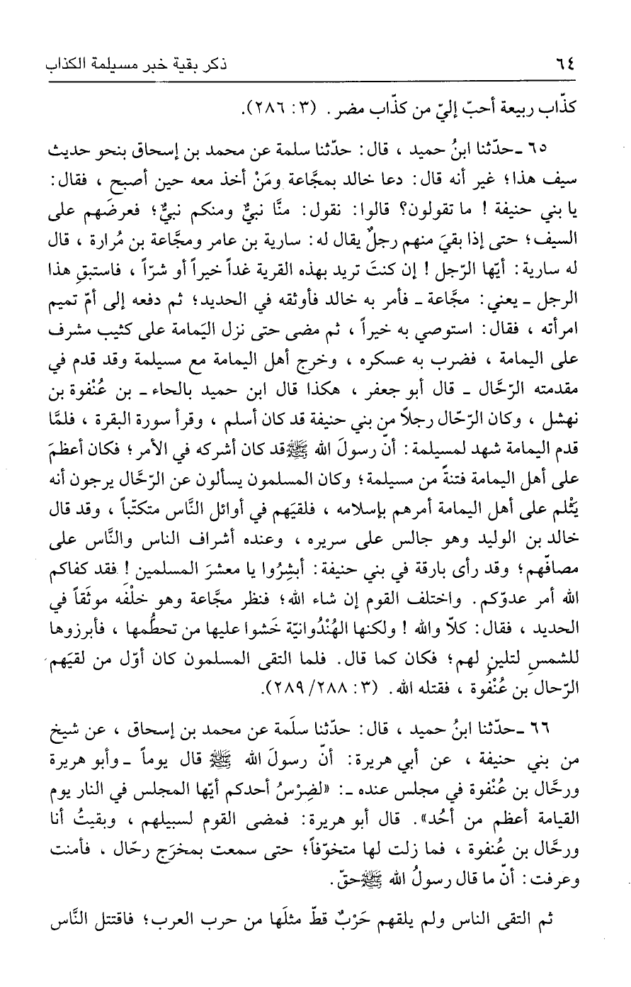 ٦٥ - حدَّثنا ابنُ حميد، قال: حدَّثنا سلمة عن محمد بن إسحاق بنحو حديث سيف هذا؛ غير أنه قال: دعا خالد بمجَّاعة ومَنْ أخذ معه حين أصبح، فقال: يا بني حنيفة! ما تقولون؟ قالوا: نقول: منَّا نبيٌّ ومنكم نبيٌّ فعرضهم على السيف؛ حتى إذا بقيَ منهم رجلٌ يقال له: سارية بن عامر ومجَّاعة بن مُرارة، قال له سارية: أيَّها الرّجل! إن كنتَ تريد بهذه القرية غدًا خيرًا أو شرًّا، فاستبقِ هذا الرجل -يعني: مجَّاعة- فأمر به خالد فأوثقه في الحديد؛ ثم دفعه إلى أمّ تميم امرأته، فقال: استوصي به خيرًا، ثم مضى حتى نزل اليَمامة على كثيب مشرف على اليمامة، فضرب به عسكره، وخرج أهل اليمامة مع مسيلمة وقد قدم في مقدمته الرّحَّال -ال أبو جعفر، هكذا قال ابن حميد بالحاء- بن عُنْفوة بن نهشل، وكان الرّحّال رجلًا من بني حنيفة قد كان أسلم، وقرأ سورة البقرة، فلمَّا قدم اليمامة شهد لمسيلمة: أنّ رسولَ الله - صلى الله عليه وسلم - قد كان أشركه في الأمر؛ فكان أعظمَ على أهل اليمامة فتنةً من مسيلمة؛ وكان المسلمون يسألون عن الرّحَّال يرجون أنه يحلم على أهل اليمامة أمرهم بإسلامه، فلقيَهم في أوائل النَّاس متكتّبًا، وقد قال خالد بن الوليد وهو جالس على سريره، وعنده أشراف الناس والنَّاس على مصافّهم؛ وقد رأى بارقة في بني حنيفة: أبشِرُوا يا معشرَ المسلمين! فقد كفاكم الله أمر عدوّكم. واختلف القوم إن شاء الله؛ فنظر مجَّاعة وهو خلْفَه موثَقًا في الحديد، فقال: كلّا والله! ولكنها الهُنْدُوانيّة خَشوا عليها من تحطُمها، فأبرزوها للشمسِ لتلين لهم؛ فكان كما قال. قلما التقى المسلمون كان أوّل من لقيَهم الرّحال بن عُنْفوة، فقتله الله. (٣: ٢٨٨/ ٢٨٩).