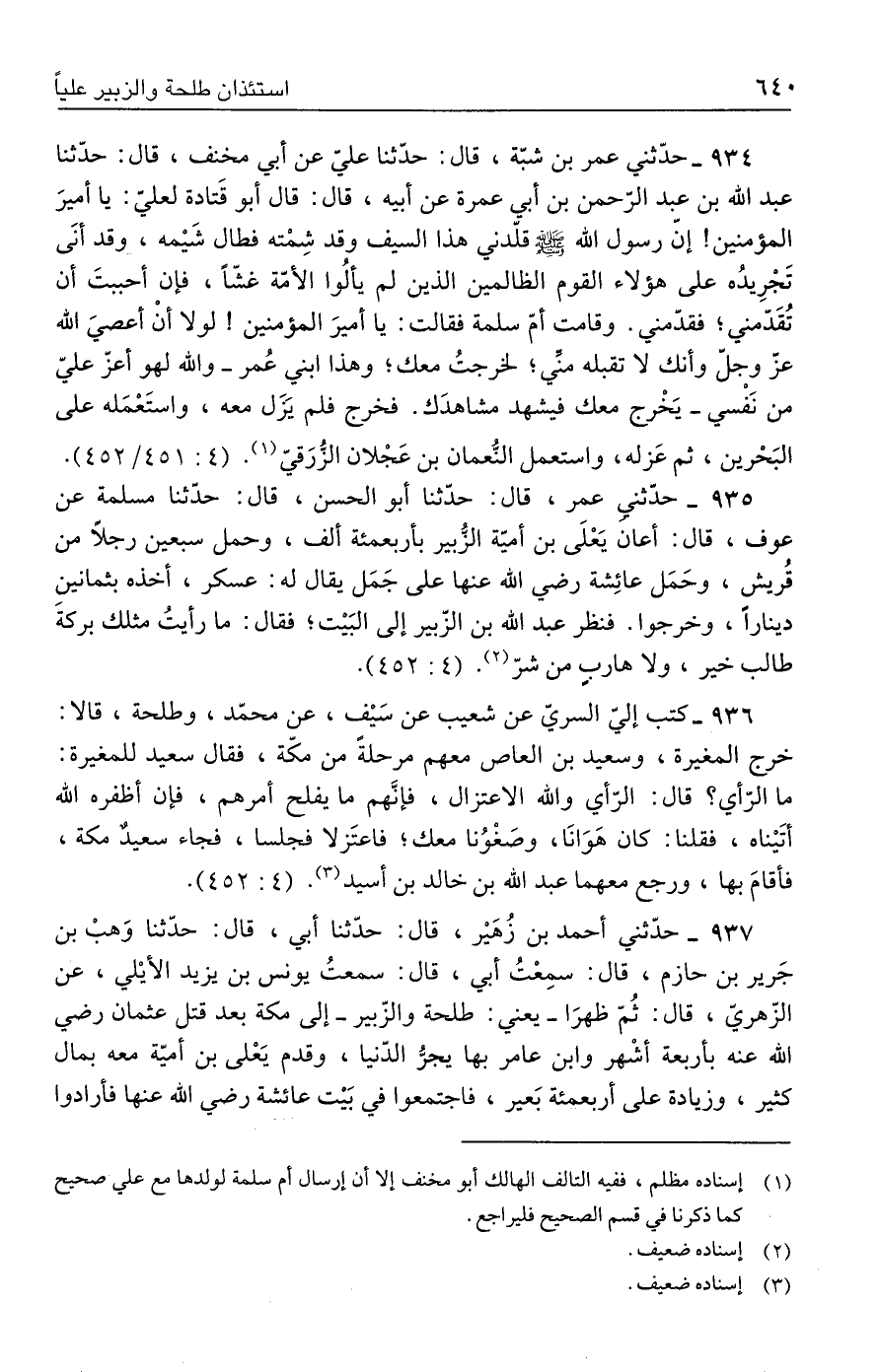 ٩٣٧ - حدّثني أحمد بن زُهَيْر، قال: حدّثنا أبي، قال: حدّثنا وَهبْ بن جَرير بن حازم، قال: سمِعْتُ أبي، قالْ سمعتُ يونس بن يزيد الأيْلي، عن الزّهريّ، قال: ثمّ ظهرَا -يعني: طلحة والزّبير- إلى مكة بعد قتل عثمان رضي الله عنه بأربعة أشْهر وابن عامر بها يجزُّ الدّنيا، وقدم يَعْلى بن أميّة معه بمال كثير، وزيادة على أربعمئة بَعير، فاجتمعوا في بَيت عائشة رضي الله عنها فأرادوا
