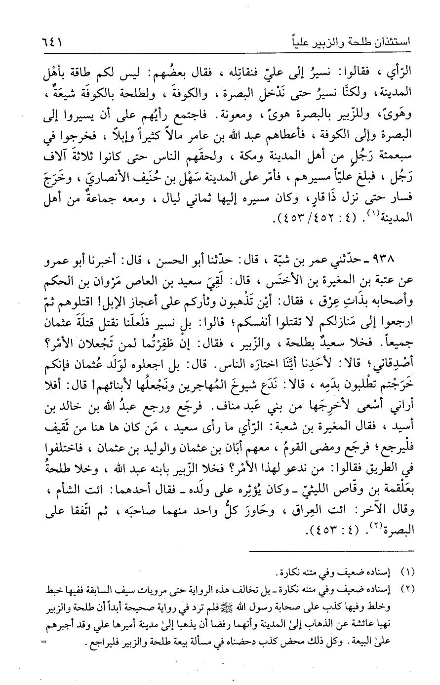 ٩٣٨ - حدّثني عمر بن شبّة، قال: حدّثنا أبو الحسن، قال: أخبرنا أبو عمرو عن عتبة بن المغيرة بن الأخنَس، قال: لَقِيَ سعيد بن العاص مَرْوان بن الحكم وأصحابه بذَاتِ عِرْق، فقال: أيْن تَذْهبون وثأركم على أعجاز الإبل! اقتلوهم ثمّ ارجعوا إلى مَنازلكم لا تقتلوا أنفسكم؛ قالوا: بل نسير فلَعلّنا نقتل قتلَةَ عثمان جميعًا. فخلا سعيدٌ بطلحة، والزّبير، فقال: إنْ ظفِرْتُما لمن تَجْعلان الأمْر؟ أصدِقاني؛ قالا: لأحَدِنا أيَّنَا اختارَه الناس. قال: بل اجعلوه لوَلَد عُثمان فإنكم خَرَجْتم تطْلبون بدَمِه، قالا: نَدَع شيوخَ المُهاجرين ونَجْعلُها لأبنائهم! قال: أفلا أراني أسْعى لأخرِجَها من بني عَبد مناف. فرجَع ورجع عبدُ الله بن خالد بن أسيد، فقال المغيرة بن شعبة: الرّأي ما رأى سعيد، مَن كان ها هنا من ثَقيف فلْيرجع؛ فرجَع ومضى القومُ، معهم أبَان بن عثمان والوليد بن عثمان، فاختلفوا في الطريق فقالوا: من ندعو لهذا الأمر؟ فخلا الزّبير بابنه عبد الله، وخلا طلحةُ بعَلْقمة بن وقّاص الليثيّ -وكان يُؤثِره على ولَده- فقال أحدهما: ائت الشأم، وقال الآخر: ائت العِراق، وحَاورَ كلُّ واحد منهما صاحبَه، ثم اتّفقا على البصرة (٢). (٤: ٤٥٣).