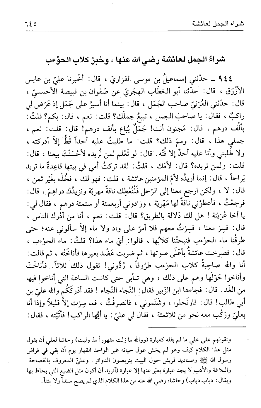 ٩٤٤ - حدّثني إسماعيلُ بن موسى الفزاريّ، قال: أخْبرنا عليّ بن عابس الأزْرَق، قال: حدّثنا أبو الخطّاب الهجَريّ عن صفْوان بن قبيصة الأحمسيّ، قال: حدّثني العُرَنيّ صاحب الجَمَل، قال: بينما أنا أسيرُ على جَمَل إذ عَرَض لي راكبٌ، فقال: يا صاحبَ الجمل، تبيعُ جملَك؟ قلت: نعم، قال: بكم؟ قلتُ: بألْف درهم، قال: مَجنون أنت! جَمَلٌ يُباع بألف درهم! قال: قلت: نعم، جملي هذا، قال: وممّ ذلك؟ قلت: ما طلبتُ عليه أحدًا قَطُّ إلّا أدركته، ولا طَلبني وأنا عليه أحدٌ إلا فُتّه. قال: لو تَعْلم لمن نُريده لأحْسَنْتَ بيعنا، قال: قلت: ولمن تريده؟ قال: لأمّك، قلتُ: لقد تركتُ أمي في بيتها قاعِدةً ما تريد بَراحًا، قال: إنما أريدُه لأمّ المؤمنين عائشة، قلت: فهو لك، فخُذْه بغَيْر ثمن، قال: لا، ولكن ارجع معنا إلى الرّحل فَلْنُعْطِك ناقة مهريّة ونزيدُك دراهِمَ، قال: فرجعْتُ، فأعطوْني ناقةً لها مَهْرية، وزادوني أربعمئة أو ستمئة درهم، فقال لي: يا أخا عُرَيْنة! هل لك دَلالة بالطريق؟ قال: قلت: نعم، أنا من أدْرك الناس، قال: فسِرْ معنا، فسِرْتُ معهم فلا أمرّ على واد ولا ماء إلّا سألوني عنه؛ حتى طرقْنا ماء الحوْءب فنبحتْنا كلابُها، قالوا: أيّ ماء هذا؟ قلتُ: ماء الحوْءب، قال: فصرخت عائشةُ بأعْلَى صوتها، ثم ضربت عَضُد بعيرها فأناخَتْه، ثم قالت: أنا والله صاحِبةُ كلاب الحوْءب طرُوقًا، رُدّوني! تقول ذلك ثلاثًا. فأناخَتْ وأناخوا حَوْلَها وهم على ذلك، وهي تأبى حتى كانت الساعة التي أناخوا فيها من الغَد. قال: فجاءها ابن الزّبير فقال: النّجاء النّجاء! فقد أدْركَكُم والله عليّ بن أبي طالب! قال: فارتَحلوا، وشَتموني، فانصرفْتُ، فما سِرْت إلَّا قليلًا وإذا أنا بعليّ ورَكْب معه نحو من ثلاثمئة، فقال لي عليّ: يا أيّها الراكب! فأتَيْته، فقال: