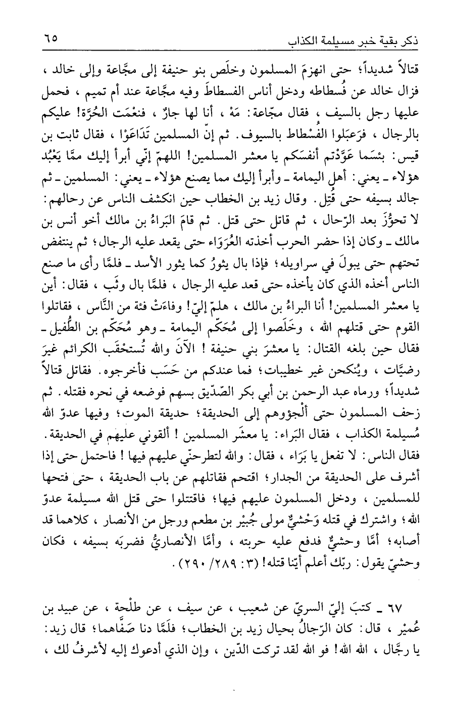 قتالًا شديدًا؛ حتى انهزمَ المسلمون وخلَص بنو حنيفة إلى مجَّاعة وإلى خالد، فزال خالد عن فُسطاطه ودخل أناس الفسطاطَ وفيه مجَّاعة عند أم تميم، فحمل عليها رجل بالسيف، فقال مجّاعة: مَهْ، أنا لها جارٌ، فنعْمَت الحُرَّة! عليكم بالرجال، فرَعبَلوا الفُسْطاط بالسيوف. ثم إنّ المسلمين تَدَاعَوْا، فقال ثابت بن قيس: بئسَما عَوَّدْتم أنفسَكم يا معشر المسلمين! اللهمّ إنّي أبرأ إليك ممَّا يَعْبُد هؤلاء -يعني: أهل اليمامة- وأبرأ إليك مما يصنع هؤلاء -يعني: المسلمين- ثم جالد بسيفه حتى قُتِل. وقال زيد بن الخطاب حين انكشف الناس عن رحالهم: لا تحوَّزَ بعد الرّحال، ثم قاتل حتى قتل. ثم قامَ البَراءُ بن مالك أخو أنس بن مالك - وكان إذا حضر الحرب أخذته العُرَوَاء حتى يقعد عليه الرجال؛ ثم ينتفض تحتهم حتى يبول في سراويله؛ فإذا بال يثورُ كما يثور الأسد - فلمَّا رأى ما صنع الناس أخذه الذي كان يأخذه حتى قعد عليه الرجال، فلمَّا بال وثَب، فقال: أين يا معشر المسلمين! أنا البراءُ بن مالك، هلمّ إليّ! وفاءَتْ فئة من النَّاس، فقاتلوا القوم حتى قتلهم الله، وخَلَصوا إلى مُحَكّم اليمامة -وهو مُحَكّم بن الطُفيل- فقال حين بلغه القتال: يا معشرَ بني حنيفة! الآنَ والله تُستحْقَب الكرائم غيرَ رضيَّات، ويُنكحن غير خطيبات؛ فما عندكم من حَسَب فأخرجوه. فقاتل قتالًا شديدًا؛ ورماه عبد الرحمن بن أبي بكر الصّدّيق بسهم فوضعه في نحره فقتله. ثم زحف المسلمون حتى ألْجؤوهم إلى الحديقة؛ حديقة الموت؛ وفيها عدوّ الله مُسيلمة الكذاب، فقال البَراء: يا معشَر المسلمين! ألقوني عليهم في الحديقة. فقال الناس: لا تفعل يا بَرَاء، فقال: والله لتطرحنّي عليهم فيها! فاحتمل حتى إذا أشرف على الحديقة من الجدار؛ اقتحم فقاتلهم عن باب الحديقة، حتى فتحها للمسلمين، ودخل المسلمون عليهم فيها؛ فاقتتلوا حتى قتل الله مسيلمة عدوّ الله؛ واشترك في قتله وَحْشيٌّ مولى جُبير بن مطعم ورجل من الأنصار، كلاهما قد أصابه؛ أمَّا وحشيٌّ فدفع عليه حربته، وأمَّا الأنصاريُّ فضربَه بسيفه، فكان وحشيّ يقول: ربّك أعلم أيّنا قتله! (٣: ٢٨٩/ ٢٩٠).