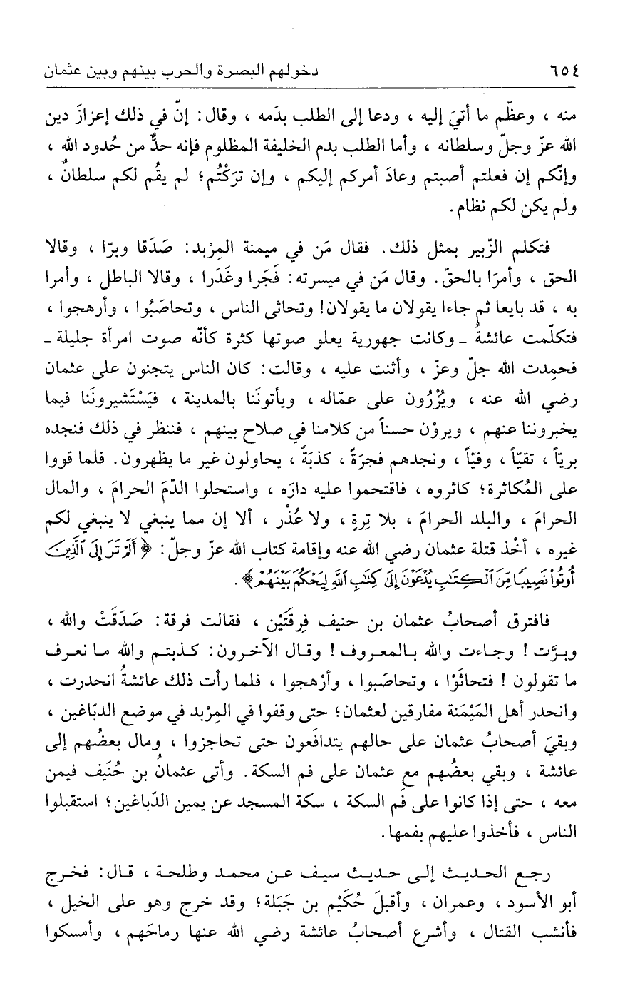 فتكلم الزبير بمثل ذلك. فقال مَن في ميمنة المِرْبد: صَدَقا وبرّا، وقالا الحق، وأمرَا بالحقّ. وقال مَن في ميسرته: فَجَرا وغَدَرا، وقالا الباطل، وأمرا به، قد بايعا ثم جاءا يقولان ما يقولان! وتحاثى الناس، وتحاصَبُوا، وأرهجوا، فتكلّمت عائشة -وكانت جهورية يعلو صوتها كثرة كأنه صوت امرأة جليلة- فحمِدت الله جلّ وعزّ، وأثنت عليه، وقالت: كان الناس يتجنون على عثمان رضي الله عنه، ويُررُون على عمّاله، ويأتونَنا بالمدينة، فيَسْتَشيرونَنا فيما يخبروننا عنهم، ويروْن حسنًا من كلامنا في صلاح بينهم، فننظر في ذلك فنجده بريًّا، تقيًّا، وفيًّا، ونجدهم فجرَةً، كذبَة، يحاولون غير ما يظهرون. فلما قووا على المُكاثرة؛ كاثروه، فاقتحموا عليه دارَه، واستحلوا الدّمَ الحرامَ، والمال الحرامَ، والبلد الحرامَ، بلا تِرةٍ، ولا عُذْر، ألا إن مما ينبغي لا ينبغي لكم غيره، أخْذ قتلة عثمان رضي الله عنه وإقامة كتاب الله عزّ وجلّ: {أَلَمْ تَرَ إِلَى الَّذِينَ أُوتُوا نَصِيبًا مِنَ الْكِتَابِ يُدْعَوْنَ إِلَى كِتَابِ اللَّهِ لِيَحْكُمَ بَيْنَهُمْ}.