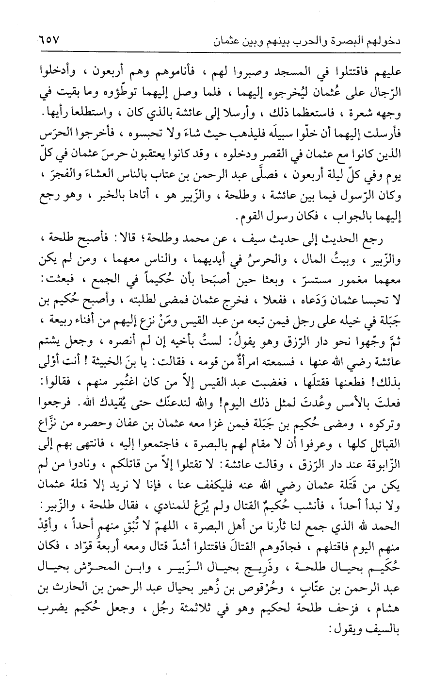 عليهم فاقتتلوا في المسجد وصبروا لهم، فأناموهم وهم أربعون، وأدخلوا الرّجال على عُثمان ليُخرجوه إليهما، فلما وصل إليهما توطّؤوه وما بقيت في وجهه شعرة، فاستعظما ذلك، وأرسلا إلى عائشة بالذي كان، واستطلعا رأيها. فأرسلت إليهما أن خلّوا سبيلَه فليذهب حيث شاءَ ولا تحبسوه، فأخرجوا الحرَس الذين كانوا مع عثمان في القصر ودخلوه، وقد كانوا يعتقبون حرسَ عثمان في كلّ يوم وفي كلّ ليلة أربعون، فصلَّى عبد الرحمن بن عتاب بالناس العشاءَ والفجرَ، وكان الرّسول فيما بين عائشة، وطلحة، والزّبير هو، أتاها بالخبر، وهو رجع إليهما بالجواب، فكان رسول القوم.