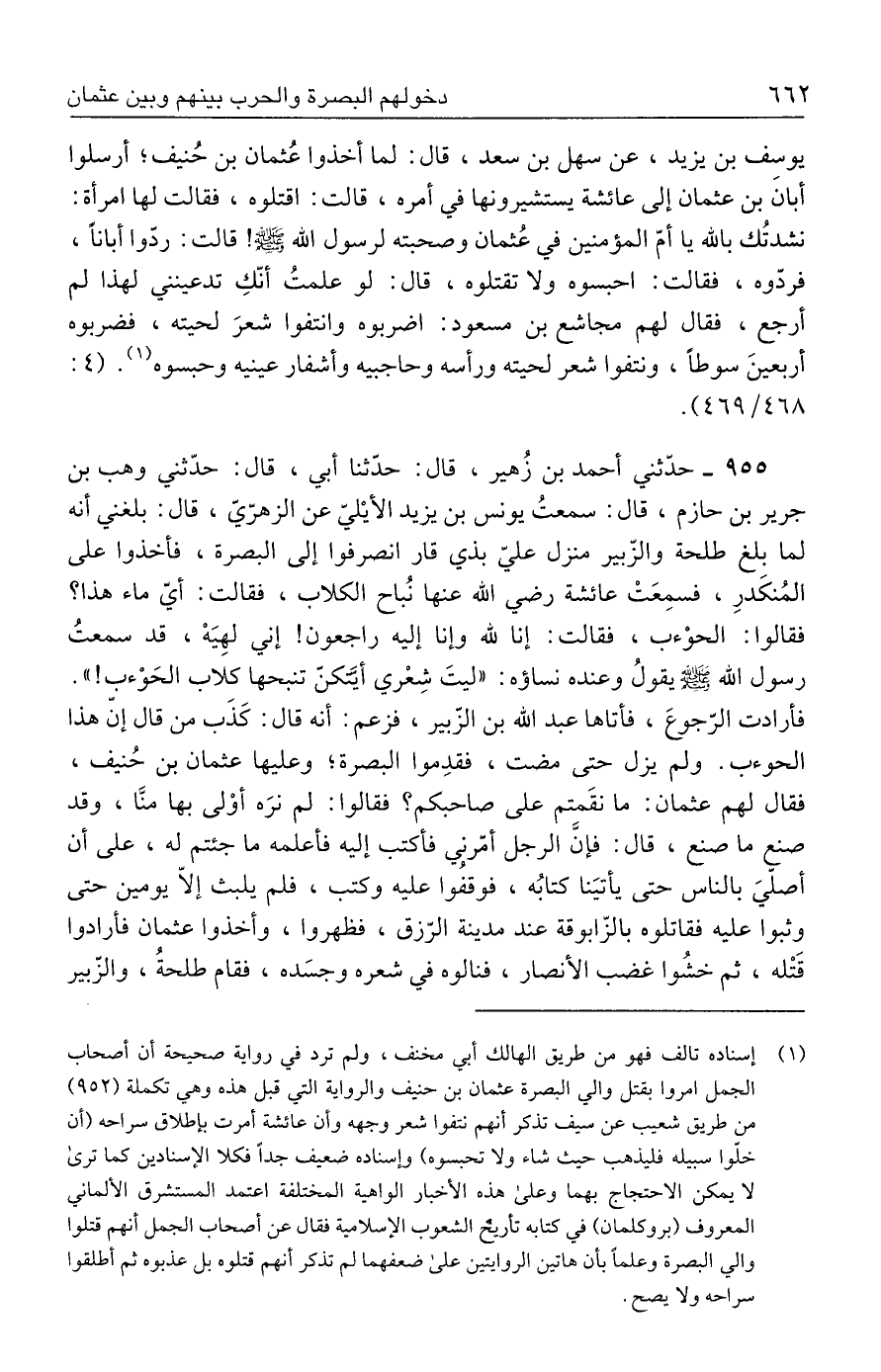 (١) إسناده تالف فهو من طريق الهالك أبي مخنف، ولم ترد في رواية صحيحة أن أصحاب الجمل أمروا بقتل والي البصرة عثمان بن حنيف والرواية التي قبل هذه وهي تكملة (٩٥٢) من طريق شعيب عن سيف تذكر أنهم نتفوا شعر وجهه وأن عائشة أمرت بإطلاق سراحه (أن خلّوا سبيله فليذهب حيث شاء ولا تحبسوه) وإسناده ضعيف جدًّا فكلا الإسنادين كما ترى لا يمكن الاحتجاج بهما وعلى هذه الأخبار الواهية المختلفة اعتمد المستشرق الألماني المعروف (بروكلمان) في كتابه تأريخ الشعوب الإسلامية فقال عن أصحاب الجمل أنهم قتلوا والي البصرة وعلمًا بأن هاتين الروايتين على ضعفهما لم تذكر أنهم قتلوه بل عذبوه ثم أطلقوا سراحه ولا يصح.