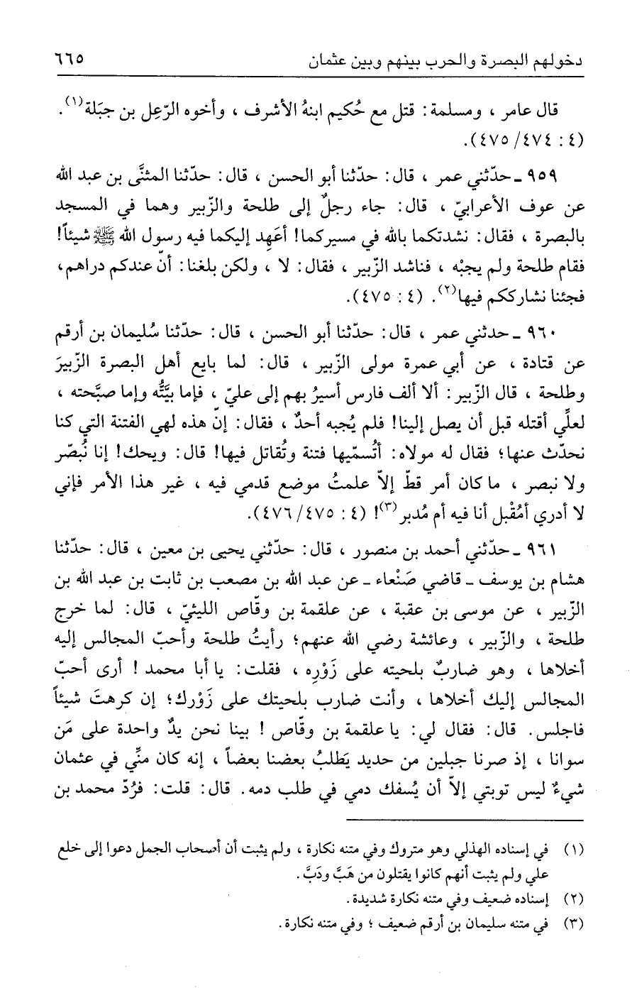 ٩٥٩ - حدَّثني عمر، قال: حدّثنا أبو الحسن، قال: حدّثنا المثنَّى بن عبد الله عن عوف الأعرابيّ، قال: جاء رجل إلى طلحة والزّبير وهما في المسجد بالبصرة، فقال: نشدتكما بالله في مسيركما! أعَهِد إليكما فيه رسول الله - صلى الله عليه وسلم - شيئًا! فقام طلحة ولم يجبْه، فناشد الزّبير، فقال: لا، ولكن بلغنا: أنّ عندكم دراهم، فجئنا نشارككم فيها (٢). (٤: ٤٧٥).