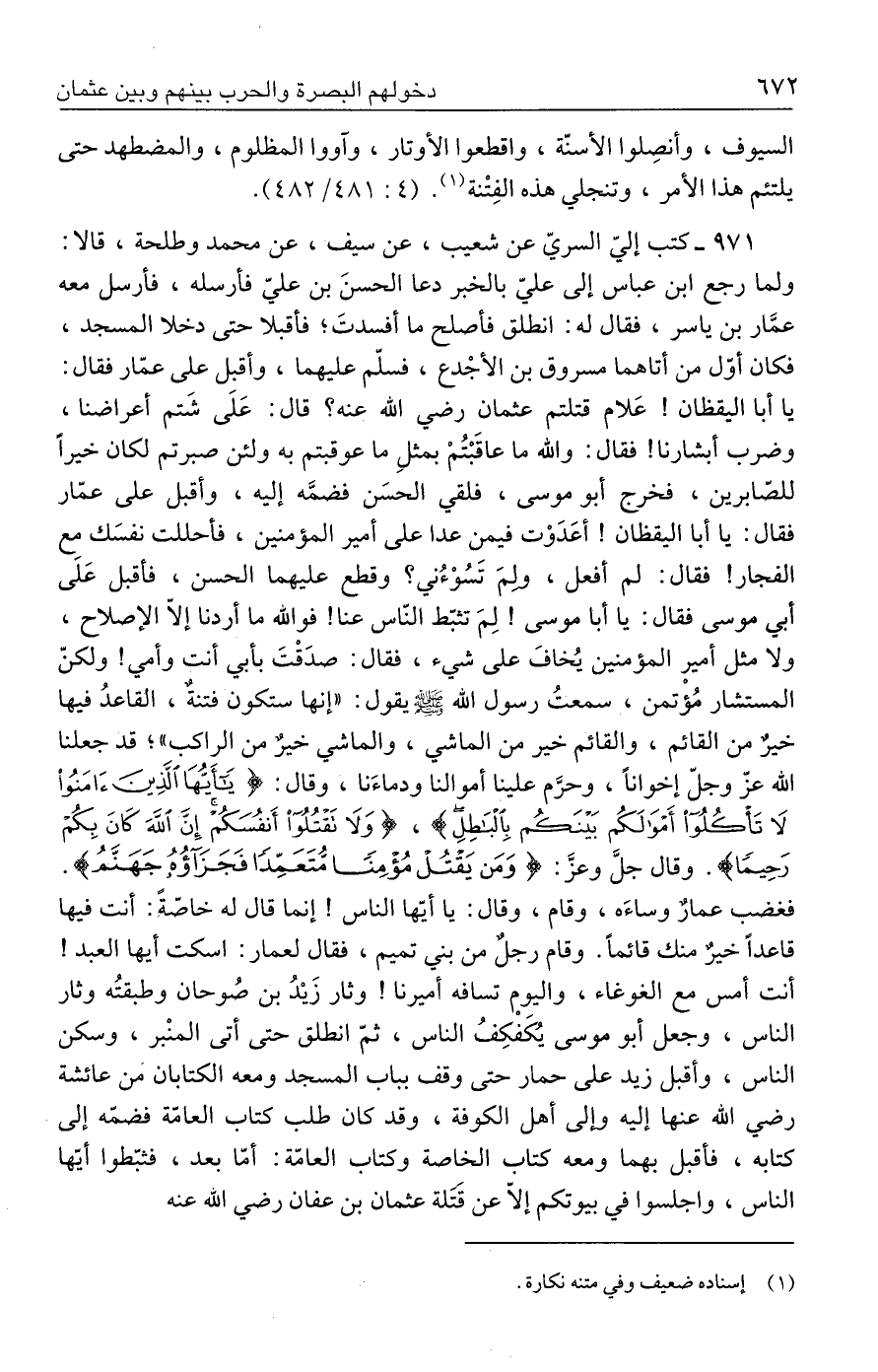 ٩٧١ - كتب إليّ السريّ عن شعيب، عن سيف، عن محمد وطلحة، قالا: ولما رجع ابن عباس إلى عليّ بالخبر دعا الحسنَ بن عليّ فأرسله، فأرسل معه عمَّار بن ياسر، فقال له: انطلق فأصلح ما أفسدتَ؛ فأقبلا حتى دخلا المسجد، فكان أوّل من أتاهما مسروق بن الأجْدع، فسلّم عليهما، وأقبل على عمّار فقال: يا أبا اليقظان! عَلام قتلتم عثمان رضي الله عنه؟ قال: عَلَى شَتم أعراضنا، وضرب أبشارنا! فقال: والله ما عاقَبْتُمْ بمثلِ ما عوقبتم به ولئن صبرتم لكان خيرًا للصّابرين، فخرج أبو موسى، فلقي الحسَن فضمَّه إليه، وأقبل على عمّار فقال: يا أبا اليقظان! أعَدَوْت فيمن عدا على أمير المؤمنين، فأحللت نفسَك مع الفجار! فقال: لم أفعل، ولمَ تَسُوْءُني؟ وقطع عليهما الحسن، فأقبل عَلى أبي موسى فقال: يا أبا موسى! لِمَ تثبّط النّاس عنا! فوالله ما أردنا إلّا الإصلاح، ولا مثل أمير المؤمنين يُخافَ على شيء، فقال: صدَقْتَ بأبي أنت وأمي! ولكنّ المستشار مُؤْتمن، سمعتُ رسول الله - صلى الله عليه وسلم - يقول: "إنها ستكون فتنةٌ، القاعدُ فيها خير من القائم، والقائم خير من الماشي، والماشي خيرٌ من الراكب"؛ قد جعلنا الله عزّ وجلّ إخوانًا، وحرَّم علينا أموالنا ودماءَنا، وقال: {يَاأَيُّهَا الَّذِينَ آمَنُوا لَا تَأْكُلُوا أَمْوَالَكُمْ بَيْنَكُمْ بِالْبَاطِلِ} , {وَلَا تَقْتُلُوا أَنْفُسَكُمْ إِنَّ اللَّهَ كَانَ بِكُمْ رَحِيمًا}. وقال جلَّ وعزَّ: {وَمَنْ يَقْتُلْ مُؤْمِنًا مُتَعَمِّدًا فَجَزَاؤُهُ جَهَنَّمُ}. فغضب عمارٌ وساءَه، وقام، وقال: يا أيّها الناس! إنما قال له خاصّةً: أنت فيها قاعدًا خيرٌ منك قائمًا. وقام رجلٌ من بني تميم، فقال لعمار: اسكت أيها العبد! أنت أمس مع الغوغاء، واليوم تسافه أميرنا! وثار زَيْدُ بن صُوحان وطبقتُه وثار الناس، وجعل أبو موسى يُكَفْكِفُ الناس، ثمّ انطلق حتى أتى المنْبر، وسكن الناس، وأقبل زيد على حمار حتى وقف بباب المسجد ومعه الكتابان من عائشة رضي الله عنها إليه وإلى أهل الكوفة، وقد كان طلب كتاب العامّة فضمّه إلى كتابه، فأقبل بهما ومعه كتاب الخاصة وكتاب العامّة: أمّا بعد، فثبّطوا أيّها الناس، واجلسوا في بيوتكم إلّا عن قتَلة عثمان بن عفان رضي الله عنه