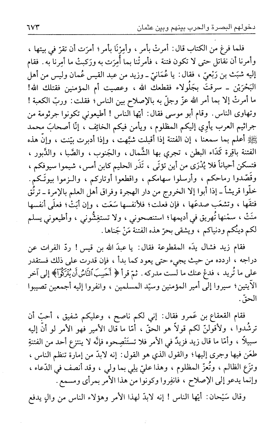 فلما فرغ من الكتاب قال: أمرتْ بأمر، وأمِرْنَا بأمر؛ أمرَت أن تقرّ في بيتها، وأمرنا أن نقاتل حتى لا تكون فتنة، فأمرتْنا بما أمِرَت به ورَكبتْ ما أمِرنا به. فقام إليه شبَث بن رَبْعيّ، فقال: يا عُمَانيّ -وزيد من عبد القيس عُمان وليس من أهل البَحْرَيْن- سرقتَ بجَلُولاء فقطعك الله، وعصيت أم المؤمنين فقتلك الله! ما أمرتْ إلا بما أمر الله عز وجلّ به بالإصلاح بين الناس؛ فقلت: وربّ الكعبة! وتهاوى الناس. وقام أبو موسى فقال: أيّها الناس! أطيعوني تكونوا جرثومة من جراثيم العرب يأوِي إليكم المظلوم، ويأمن فيكم الخائِف، إنّا أصحابَ محمد - صلى الله عليه وسلم - أعلم بما سمعنا، إن الفتنة إذا أقبلت شبَّهت، وإذا أدبرت بيّنت، وإنّ هذه الفتنة باقِرة كَدَاء البطن، تجري بها الشَّمال، والجَنوب، والصَّبا، والدَّبور، فتسكن أحيانًا فلا يُدْرَى من أين تؤتَى، تَذَر الحليم كابن أمس، شيموا سيوفكم، وقَصّدوا رماحكم، وأرسلوا سهامكم، واقطعوا أوتاركم، والزموا بيوتَكم. خلّوا قريشًا - إذا أبوا إلا الخروج من دار الهجرة وفراق أهل العلم بالإمرة - ترتُق فتقَها، وتشعَب صدعَها، فإن فعلت؛ فلأنفسها سَعَت، وإن أبَتْ؛ فعلَى أنفسها منَتْ، سمْنها تُهريق في أديمها؛ استنصحوني، ولا تستغِشُّوني، وأطيعوني يسلم لكم دينكم ودنياكم، ويشقى بحرّ هذه الفتنة مَنْ جَناها.