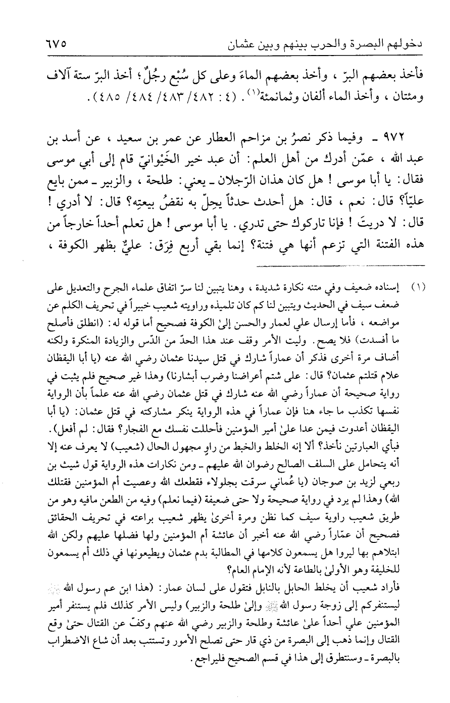 (١) إسناده ضعيف وفي متنه نكارة شديدة، وهنا يتبين لنا سرّ اتفاق علماء الجرح والتعديل على ضعف سيف في الحديث ويتبين لنا كم كان تلميذه وراويته شعيب خبيرًا في تحريف الكلم عن مواضعه، فأما إرسال علي لعمار والحسن إلى الكوفة فصحيح أما قوله له: (انطلق فأصلح ما أفسدت) فلا يصح. وليت الأمر وقف عند هذا الحدّ من الدّس والزيادة المنكرة ولكنه أضاف مرة أخرى فذكر أن عمارًا شارك في قتل سيدنا عثمان رضي الله عنه (يا أبا اليقظان علام قتلتم عثمان؟ قال: على شتم أعراضنا وضرب أبشارنا) وهذا غير صحيح فلم يثبت في رواية صحيحة أن عمارًا رضي الله عنه شارك في قتل عثمان رضي الله عنه علمًا بأن الرواية نفسها تكذب ما جاء هنا فإن عمارًا في هذه الرواية ينكر مشاركته في قتل عثمان: (يا أبا اليقظان أعدوت فيمن عدا على أمير المؤمنين فأحللت نفسك مع الفجار؟ فقال: لم أفعل). فبأي العبارتين نأخذ؟ ألا إنه الخلط والخبط من راو مجهول الحال (شعيب) لا يعرف عنه إلا أنه يتحامل على السلف الصالح رضوان الله عليهم- ومن نكارات هذه الرواية قول شيث بن ربعي لزيد بن صوجان (يا عُماني سرقت بجلولاء فقطعك الله وعصيت أم المؤمنين فقتلك الله) وهذا لم يرد في رواية صحيحة ولا حتى ضعيفة (فيما نعلم) وفيه من الطعن ما فيه وهو من طريق شعيب راوية سيف كما نظن ومرة أخرى يظهر شعيب براعته في تحريف الحقائق فصحيح أن عمارًا رَضي الله عنه أخبر أن عائشة أم المؤمنين ولها فضلها عليهم ولكن الله ابتلاهم بها ليروا هل يسمعون كلامها في المطالبة بدم عثمان ويطيعونها في ذلك أم يسمعون للخليفة وهو الأولى بالطاعة لأنه الإمام العام؟