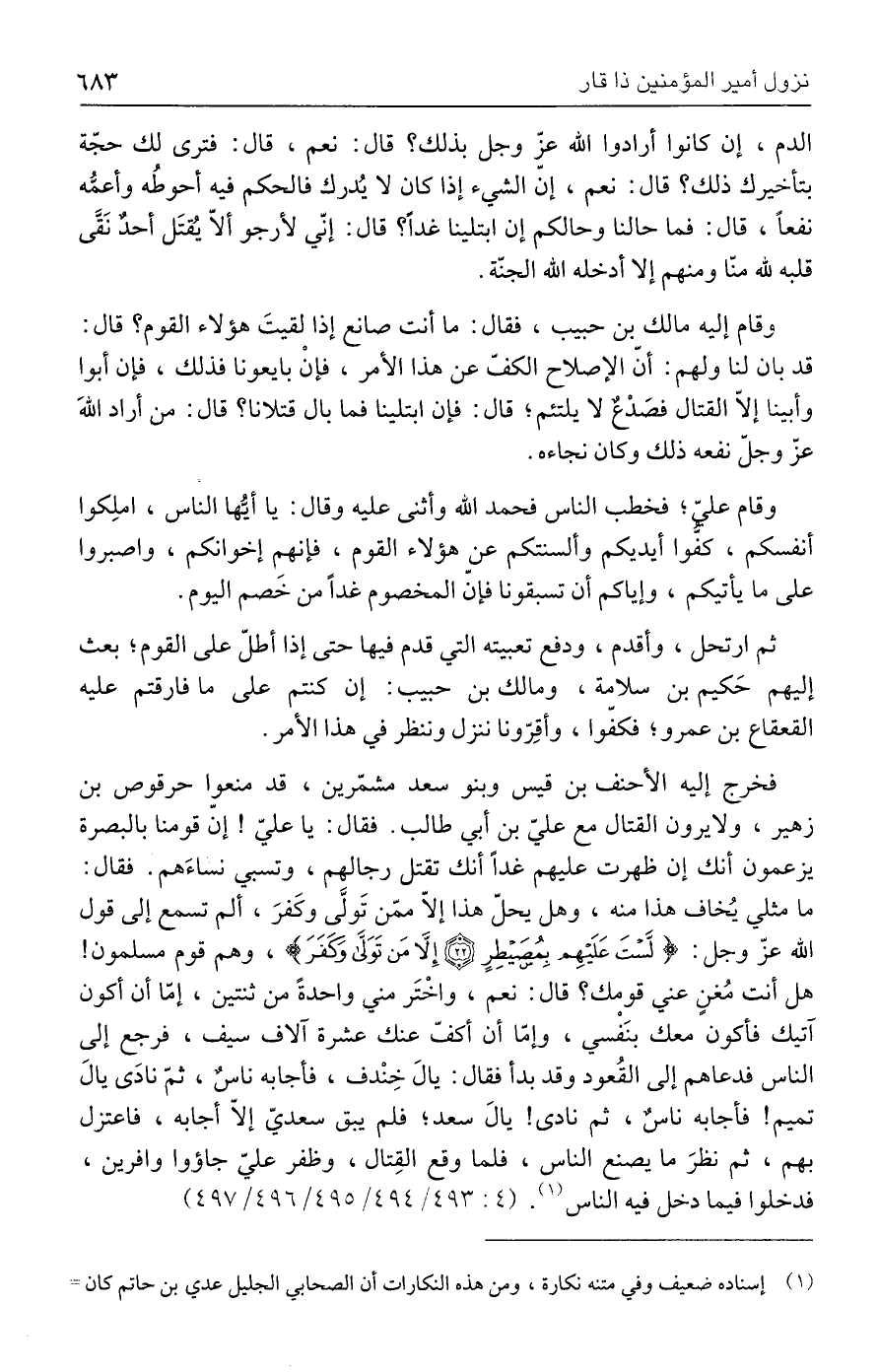 فخرج إليه الأحنف بن قيس وبنو سعد مشمّرين، قد منعوا حرقوص بن زهير، ولا يرون القتال مع عليّ بن أبي طالب. فقال: يا عليّ! إنّ قومنا بالبصرة يزعمون أنك إن ظهرت عليهم غدًا أنك تقتل رجالهم، وتسبي نساءَهم. فقال: ما مثلي يُخاف هذا منه، وهل يحلّ هذا إلّا ممّن تَولَّى وكَفرَ، ألم تسمع إلى قول الله عزّ وجل: {لَسْتَ عَلَيْهِمْ بِمُصَيْطِرٍ (٢٢) إِلَّا مَنْ تَوَلَّى وَكَفَرَ}، وهم قوم مسلمون! هل أنت مُغنٍ عني قومك؟ قال: نعم، واخْتَر مني واحدة من ثنتين، إمَّا أن أكون آتيك فأكون معك بنَفْسي، وإمّا أن أكفّ عنك عشرة آلاف سيف، فرجع إلى الناس فدعاهم إلى القُعود وقد بدأ فقال: يالَ خِنْدف، فأجابه ناسٌ، ثمّ نادَى يالَ تميم! فأجابه ناسٌ، ثم نادى! يالَ سعد؛ فلم يبق سعديّ إلّا أجابه، فاعتزل بهم، ثم نظرَ ما يصنع الناس، فلما وقع القِتال، وظفر عليّ جاؤوا وافرين، فدخلوا فيما دخل فيه الناس (١). (٤: ٤٩٣/ ٤٩٤/ ٤٩٥/ ٤٩٦/ ٤٩٧)